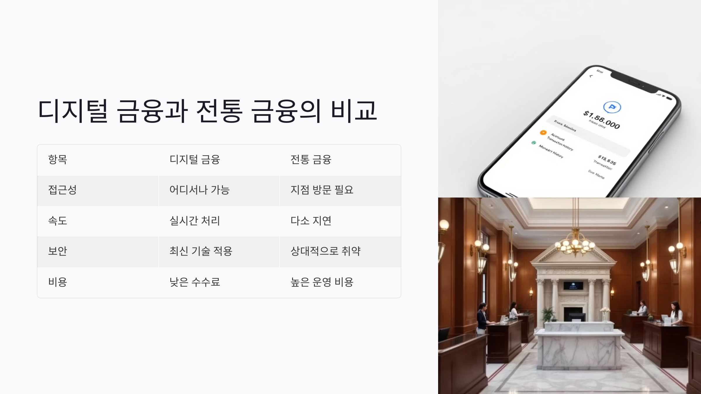 | 항목 | 디지털 금융 | 전통 금융 |