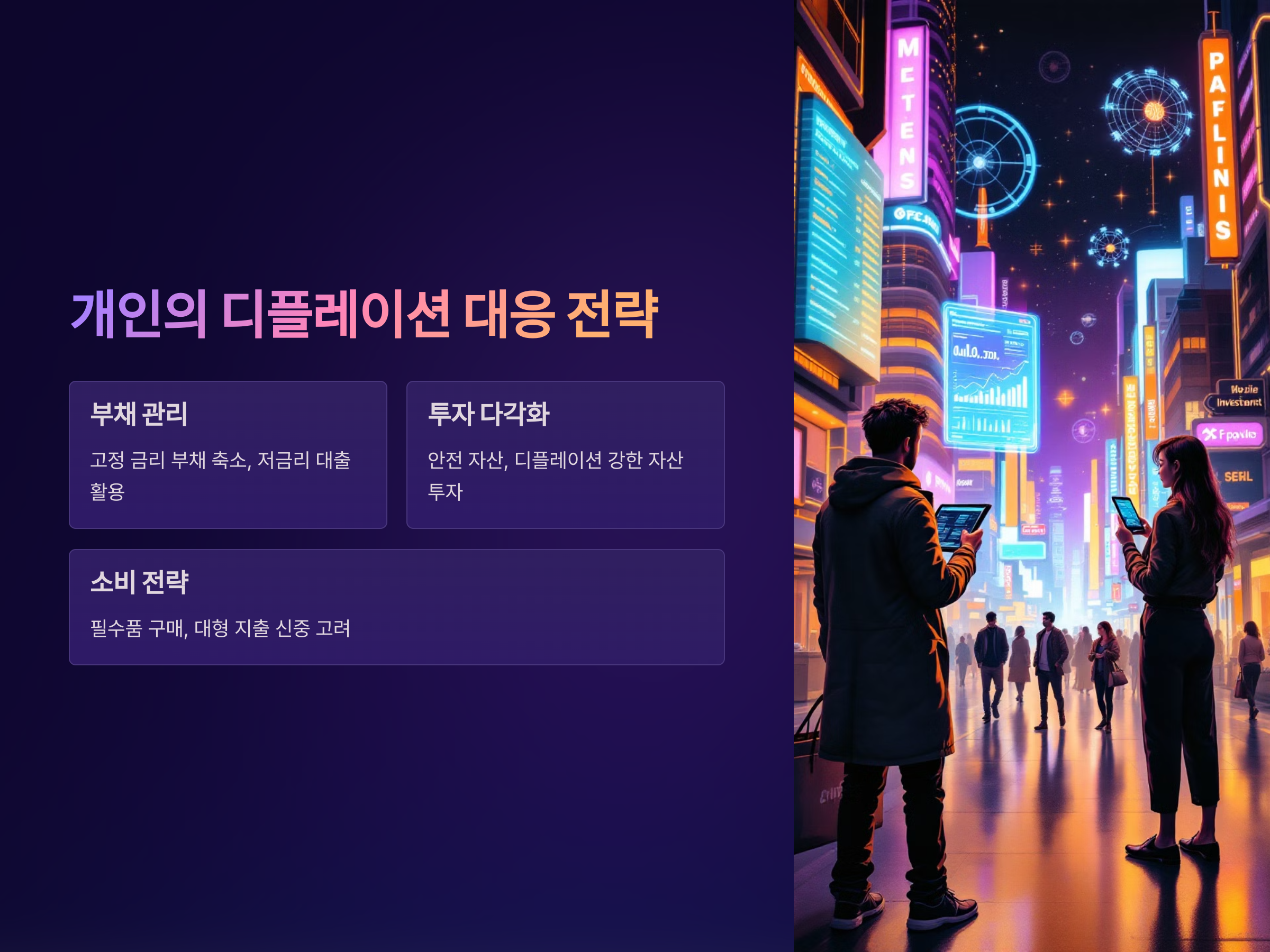 - 투자 다각화: 안전 자산이나 디플레이션에 강한 자산에 투자하여 자산 가치를 보호합니다.