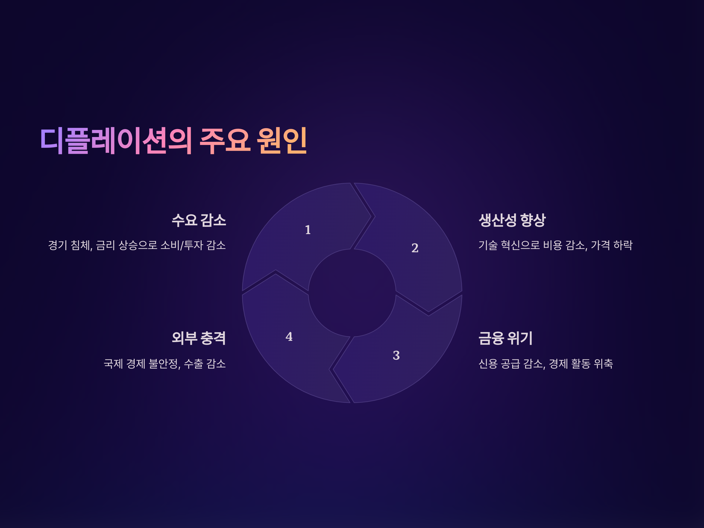 - 외부 충격: 국제 경제 상황의 불안정이나 전 세계적인 경기 침체는 수출 감소와 경제 활동의 위축을 가져와 물가 하락을 초래할 수 있습니다.
