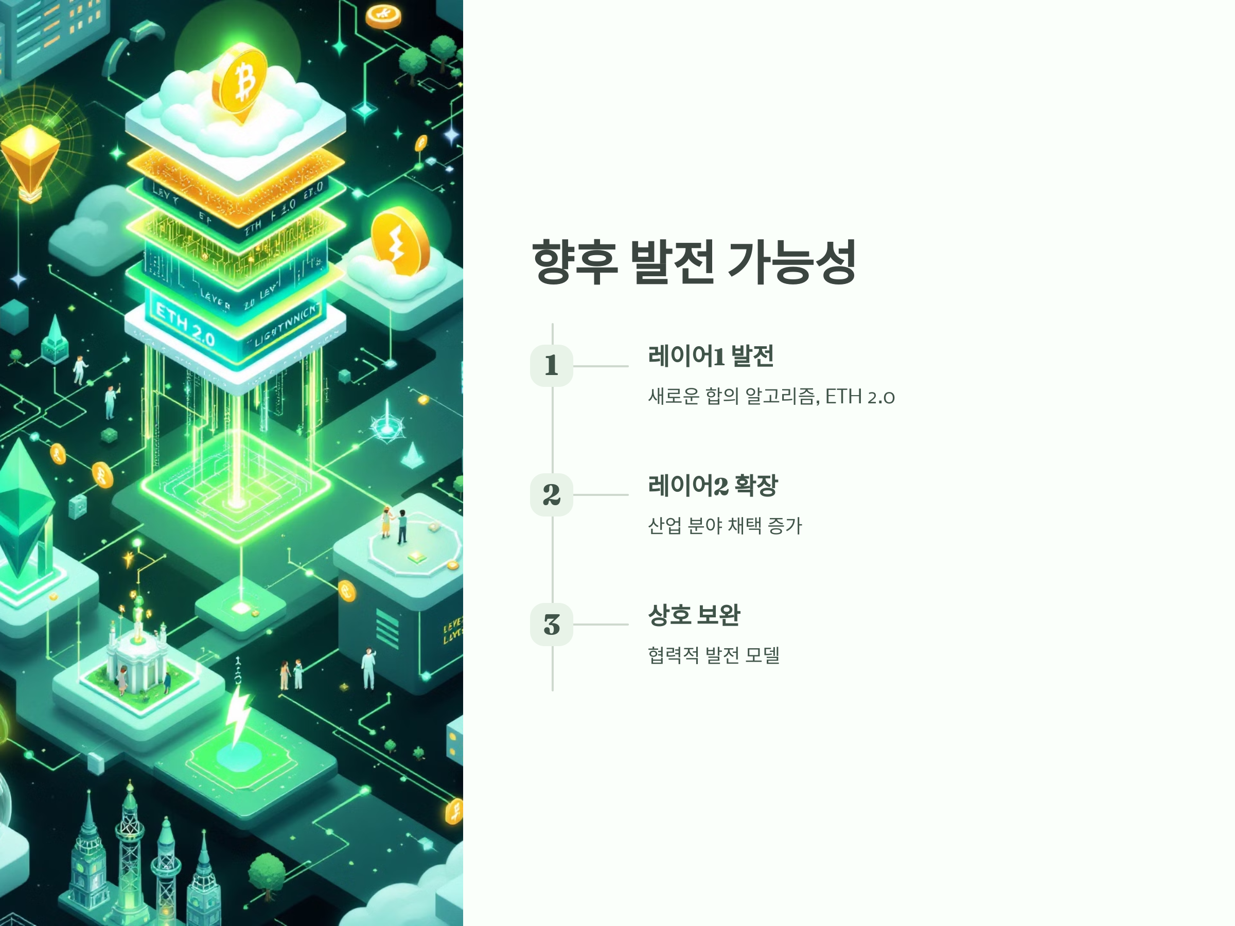 레이어1과 레이어2는 서로 보완적인 관계에 있으며, 향후 블록체인 기술의 발전을 위해 함께 발전할 가능성이 큽니다. 레이어1은 블록체인의 기본적인 성질을 그대로 유지하면서도, 새로운 합의 알고리즘이나 최적화 기술을 통해 성능을 향상시킬 수 있는 방법들이 제시되고 있습니다. 예를 들어, 이더리움의 ETH 2.0은 지분 증명(PoS) 방식으로의 전환을 통해 확장성과 보안성 두 마리 토끼를 잡으려 하고 있습니다.