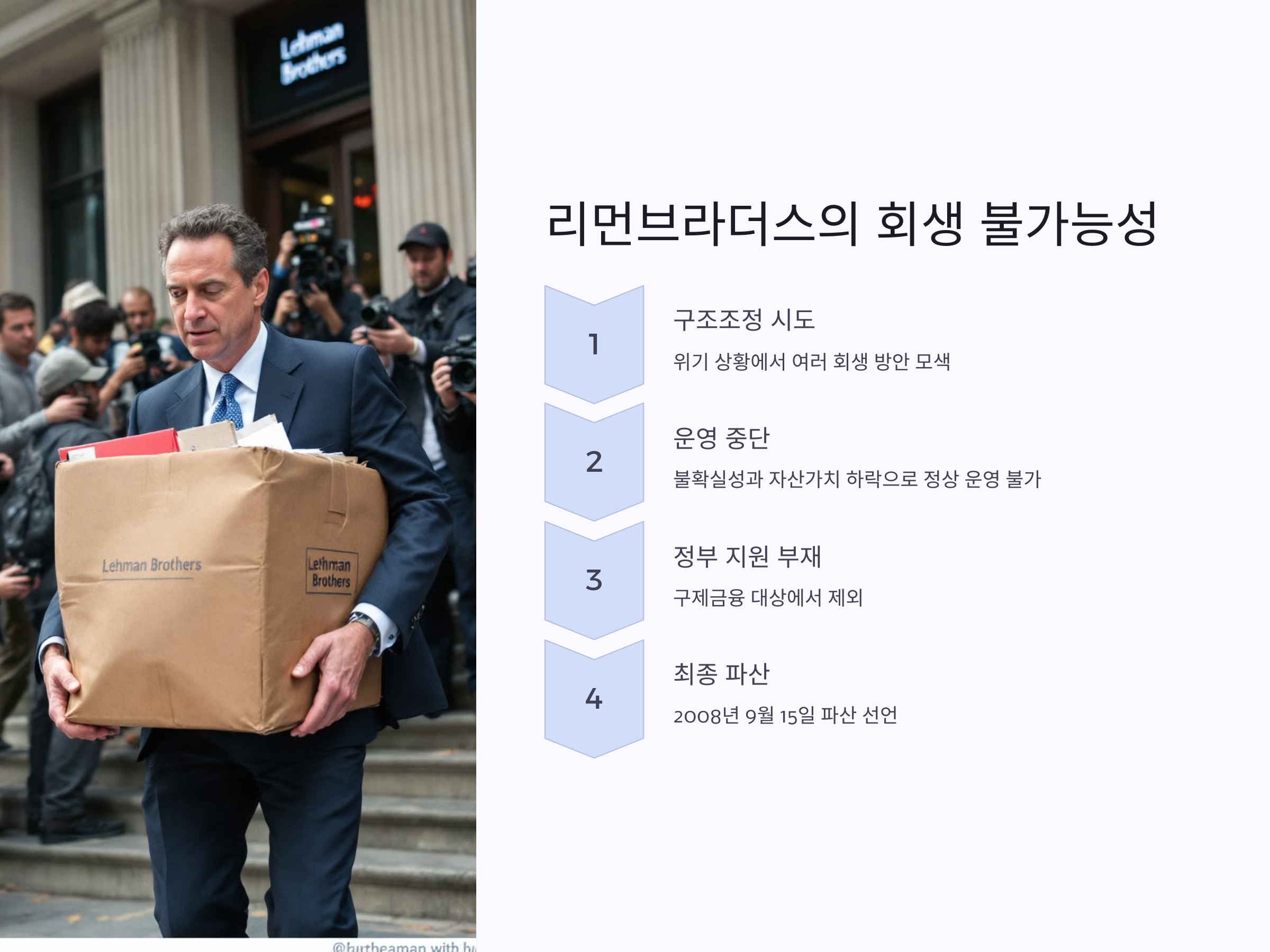 리먼브라더스는 위기 상황에서 몇 차례 구조조정을 시도했지만, 결국 회생 불가능한 상황에 직면하게 되었습니다. 금융 시장의 불확실성과 급격히 떨어지는 자산가치, 그리고 수많은 부채들이 상호작용하면서 리먼브라더스는 정상적인 운영을 이어갈 수 없었습니다. 정부나 다른 금융기관들이 적극적으로 지원하지 않았던 점도 큰 영향을 미쳤습니다. 리먼브라더스가 당시 정부의 구제금융 대상에 포함되지 않은 이유는 그들이 가진 부채의 규모와 더불어 다른 금융기관들에 미치는 연쇄적인 영향 때문이었습니다.
