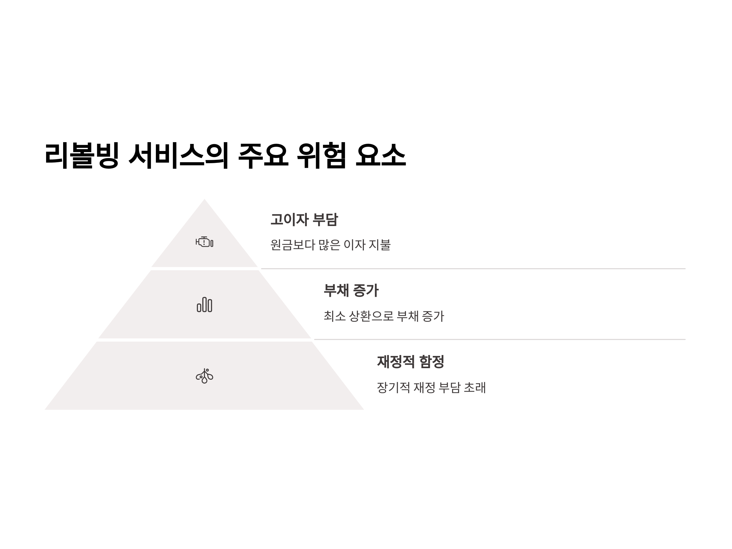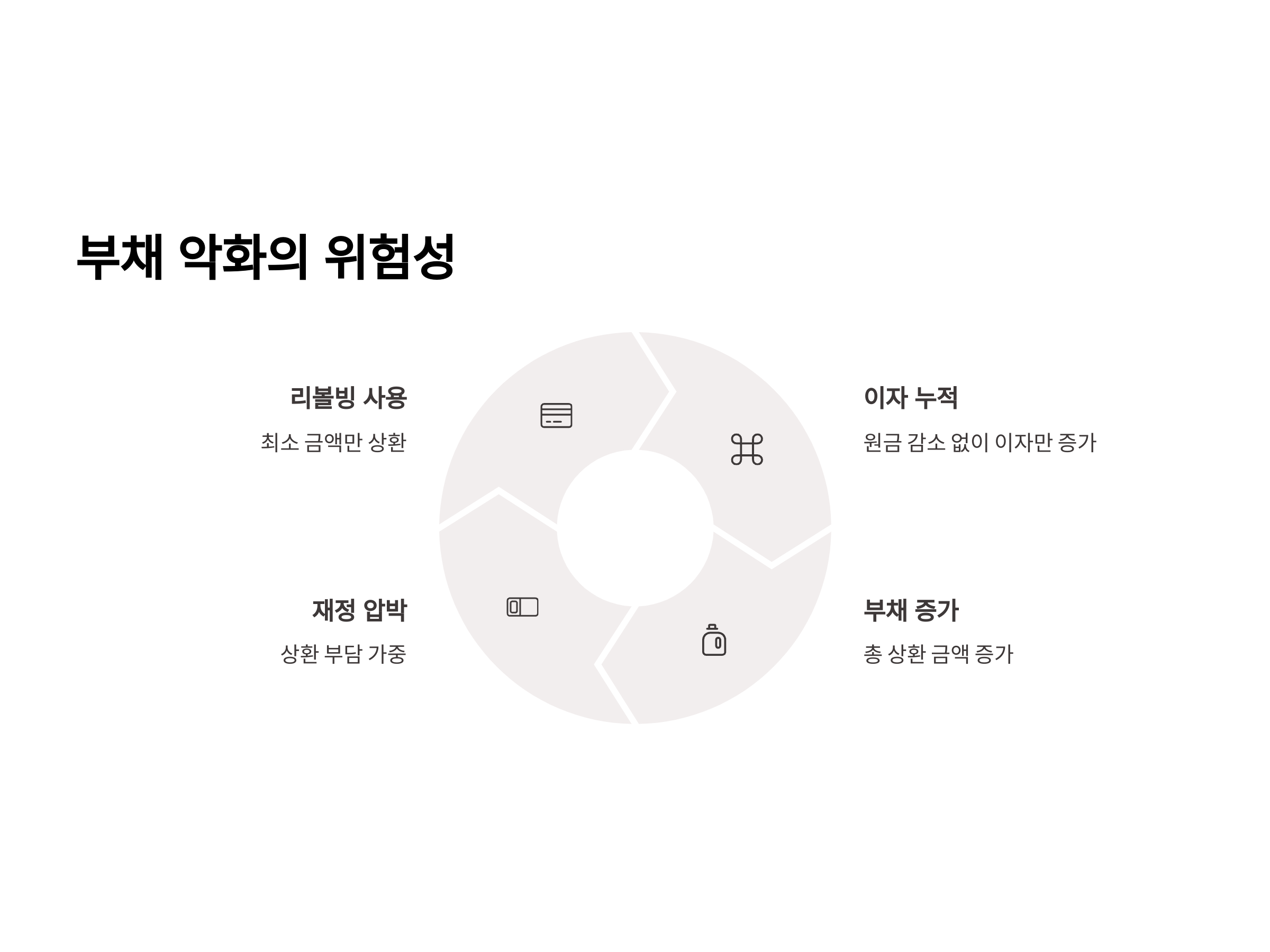 리볼빙 서비스를 계속 사용하면 점차 부채가 커지고, 이를 갚기 위한 부담이 커집니다. 많은 사람들은 처음에 리볼빙 서비스를 이용하면서, 대출금 상환이 매달 일정한 금액만 갚으면 된다고 생각해 마음이 놓입니다. 그러나 사실상 이 구조는 부채를 줄이는 것이 아니라, 오히려 증가시키는 방식입니다. 특히 이자율이 높은 신용카드나 대출의 경우, 원금이 제대로 상환되지 않아 점차 부채가 쌓이게 됩니다.