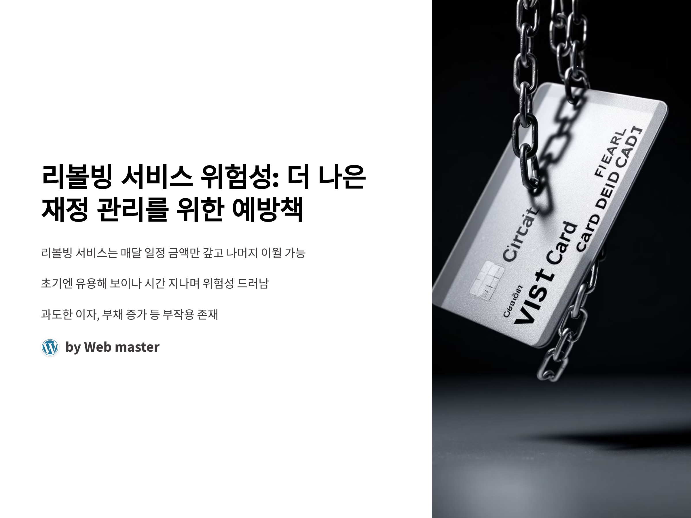 리볼빙 서비스의 또 다른 위험성은 이 월별 최소 상환금만 갚을 경우, 자칫 부채가 점점 불어나게 된다는 점입니다. 소비자는 매달 적은 금액만 갚아도 된다는 안일한 생각에 점차 재정적 문제를 키울 수 있으며, 결국 이자와 원금이 함께 불어나게 됩니다. 또한, 장기간 사용하게 되면 대출 금액이 폭증할 수 있어 나중에는 더 큰 재정적 부담을 안게 됩니다.
