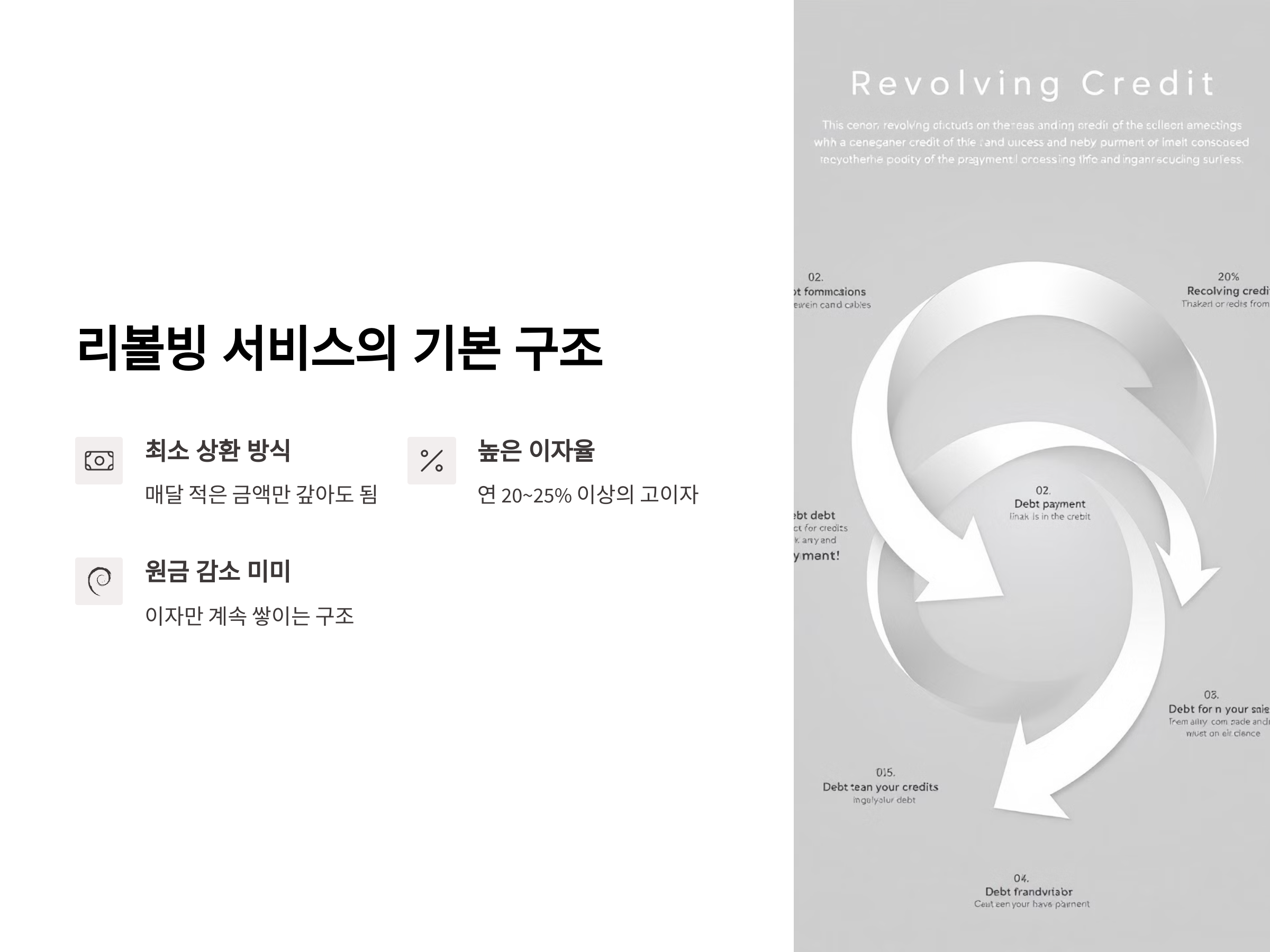 이러한 리볼빙 서비스의 특성을 잘 모르고 사용하는 경우, 결국 소비자는 월별 최소 상환금만 갚다가 이자가 계속 쌓여서 더 큰 금액을 지불해야 하는 상황에 직면할 수 있습니다. 이처럼 처음에는 유리해 보이던 서비스가, 점차 부채를 키우는 악순환을 초래하게 될 수 있습니다.
