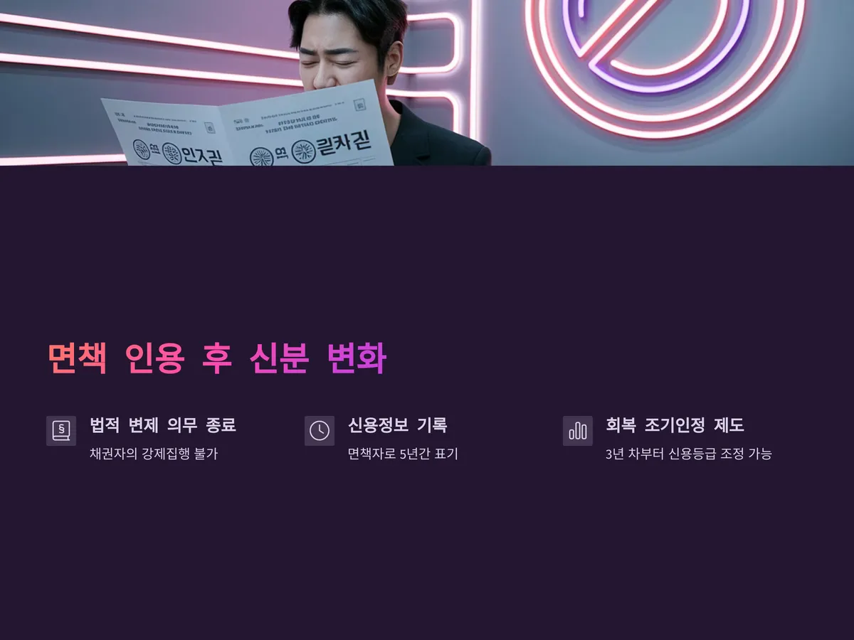 대표적으로 신용회복에 시간이 필요하며, 금융기관의 신용정보에는 '면책자'로 표기됩니다. 이는 통상 5년간 기록되며, 이후 삭제됩니다. 다만, 2025년부터 일부 금융사는 '회복 조기인정 제도'를 통해 3년 차부터 신용등급을 조정하고 있습니다. 이 부분은 실제로 면책 이후 빠르게 정상 금융생활로 복귀하고자 하는 이들에게 중요한 기회가 됩니다.
