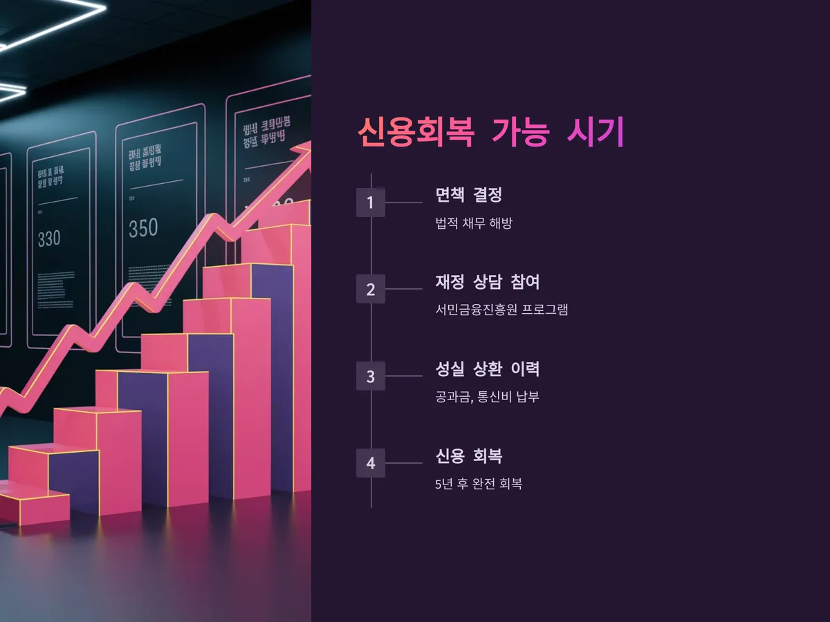 면책 이후 신용정보에서 회복이 가능하기까지 보통 5년이 소요됩니다. 하지만 이 기간을 단축시키는 실질적인 방법이 있습니다. 바로 '서민금융진흥원'이나 '신용회복위원회'를 통한 재정 상담 및 프로그램 참여입니다.