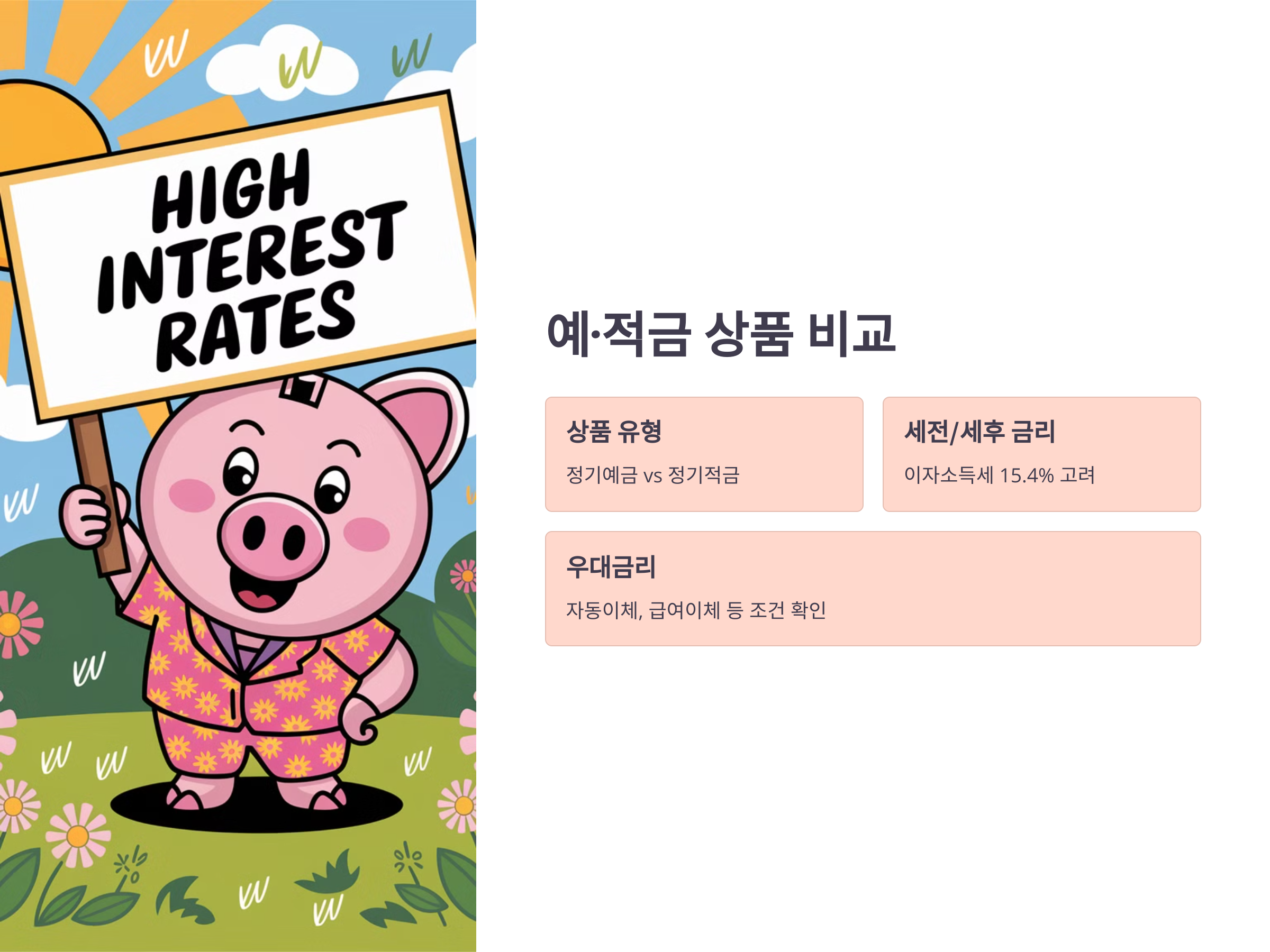 - 정기예금 vs 정기적금: 정기예금은 목돈을 예치하는 방식, 정기적금은 매달 일정 금액을 저축하는 방식