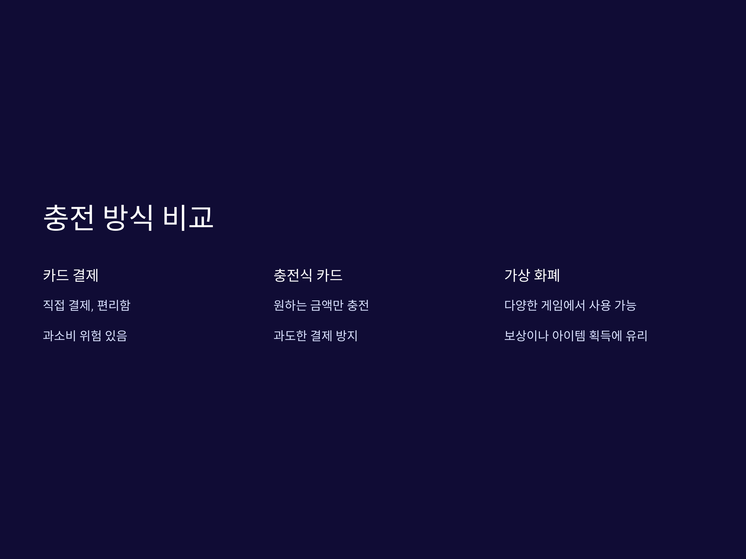 모바일 게임 결제에서 카드를 사용할 수도 있지만, 충전식 카드나 가상 화폐를 사용하는 경우도 많습니다. 이를 비교해보면, 카드 결제와 충전식 카드 또는 가상 화폐를 이용한 결제는 장단점이 있습니다.