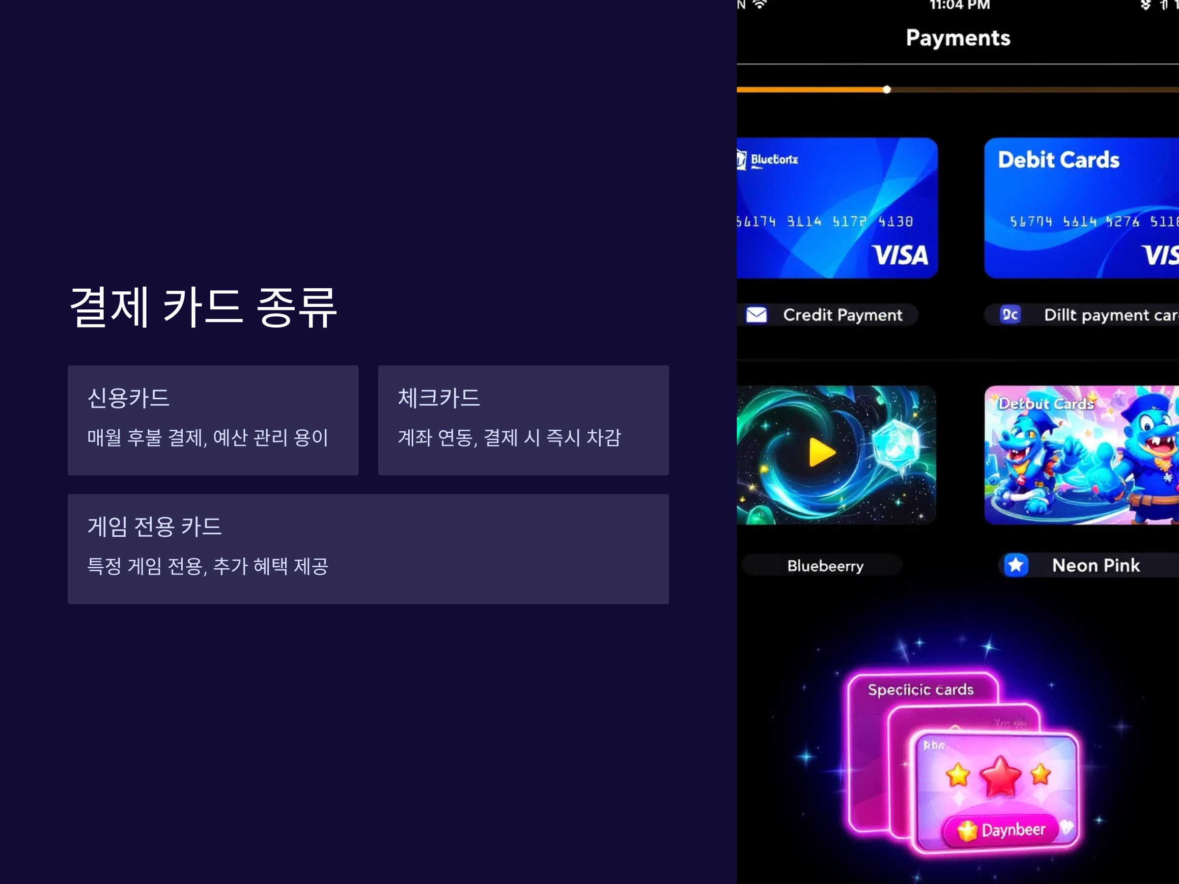 모바일 게임에서 사용하는 결제 카드에는 여러 종류가 있습니다. 가장 일반적으로 사용되는 카드는 신용카드와 체크카드입니다. 이 카드들은 대부분의 온라인 결제 시스템에서 사용 가능하며, 모바일 게임에서도 많이 활용됩니다. 또한, 특정 게임에서 제공하는 전용 카드나 선불 카드를 사용할 수도 있습니다.
