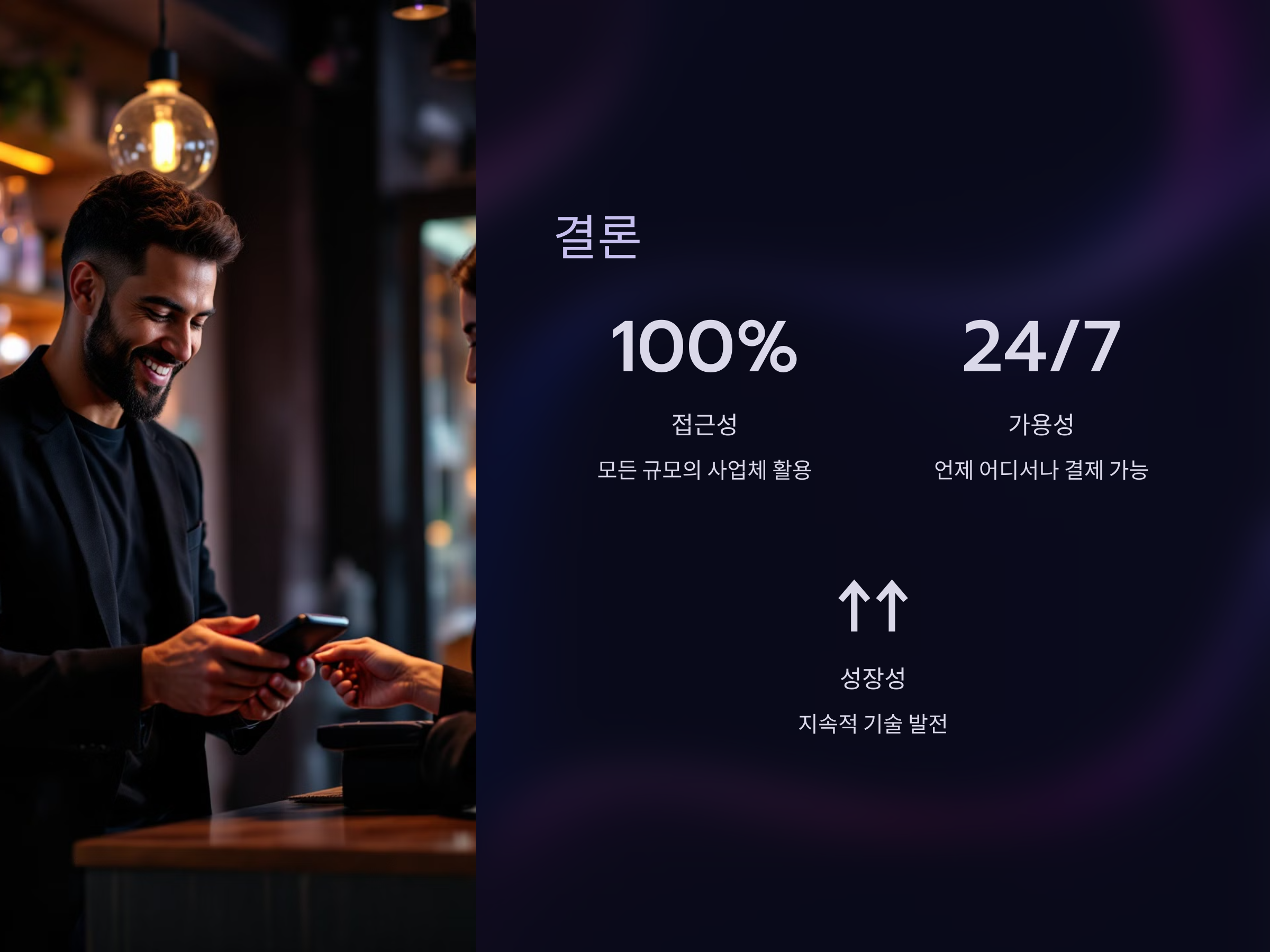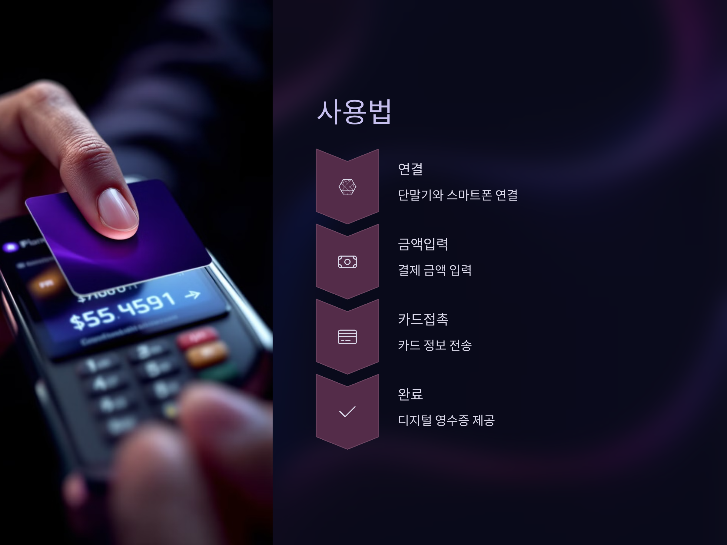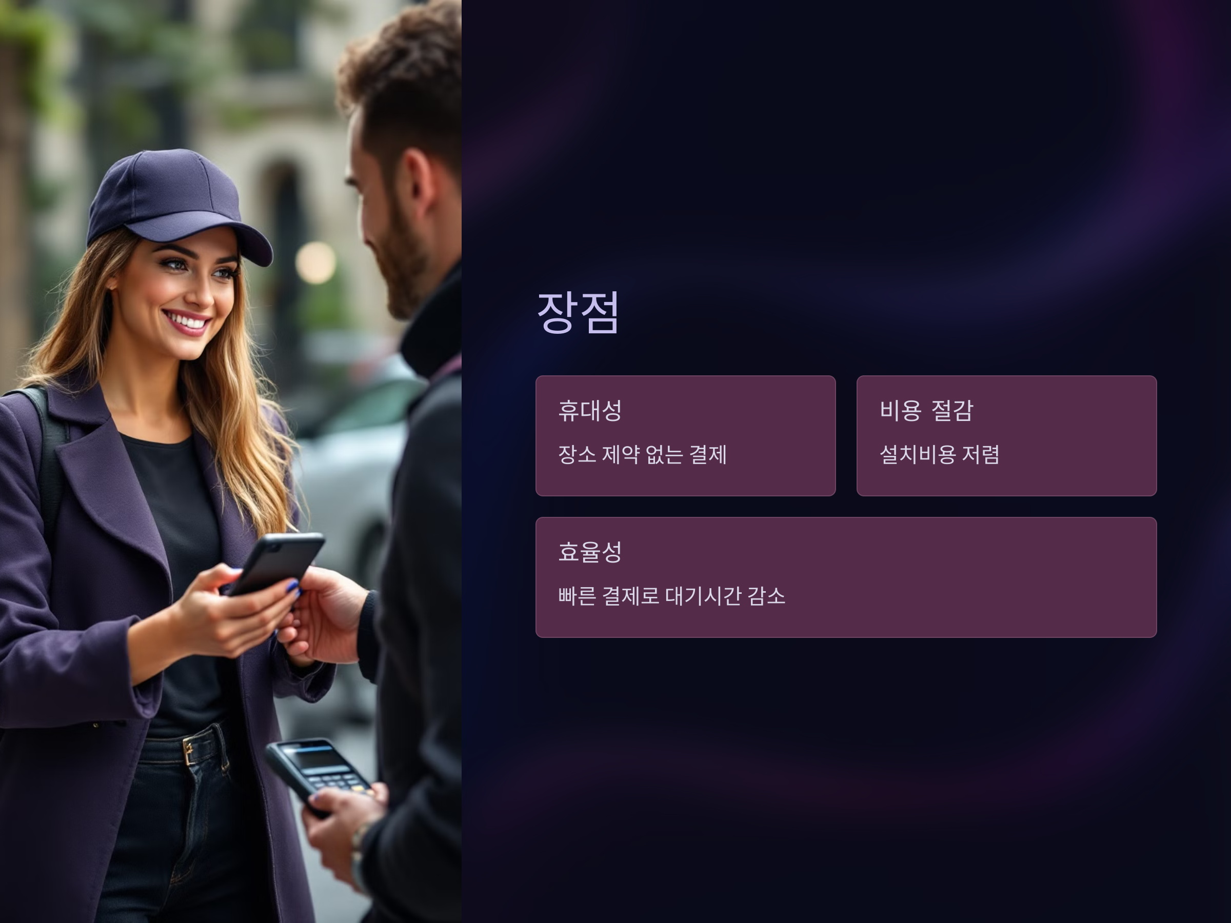 뿐만 아니라, 결제 과정이 간편하고 빠르기 때문에 고객의 대기 시간이 줄어들고, 결제 처리가 더 효율적으로 이루어집니다. 이런 빠르고 간편한 결제 과정은 고객 만족도를 높이며, 사업자에게는 효율적인 운영을 가능하게 만듭니다.