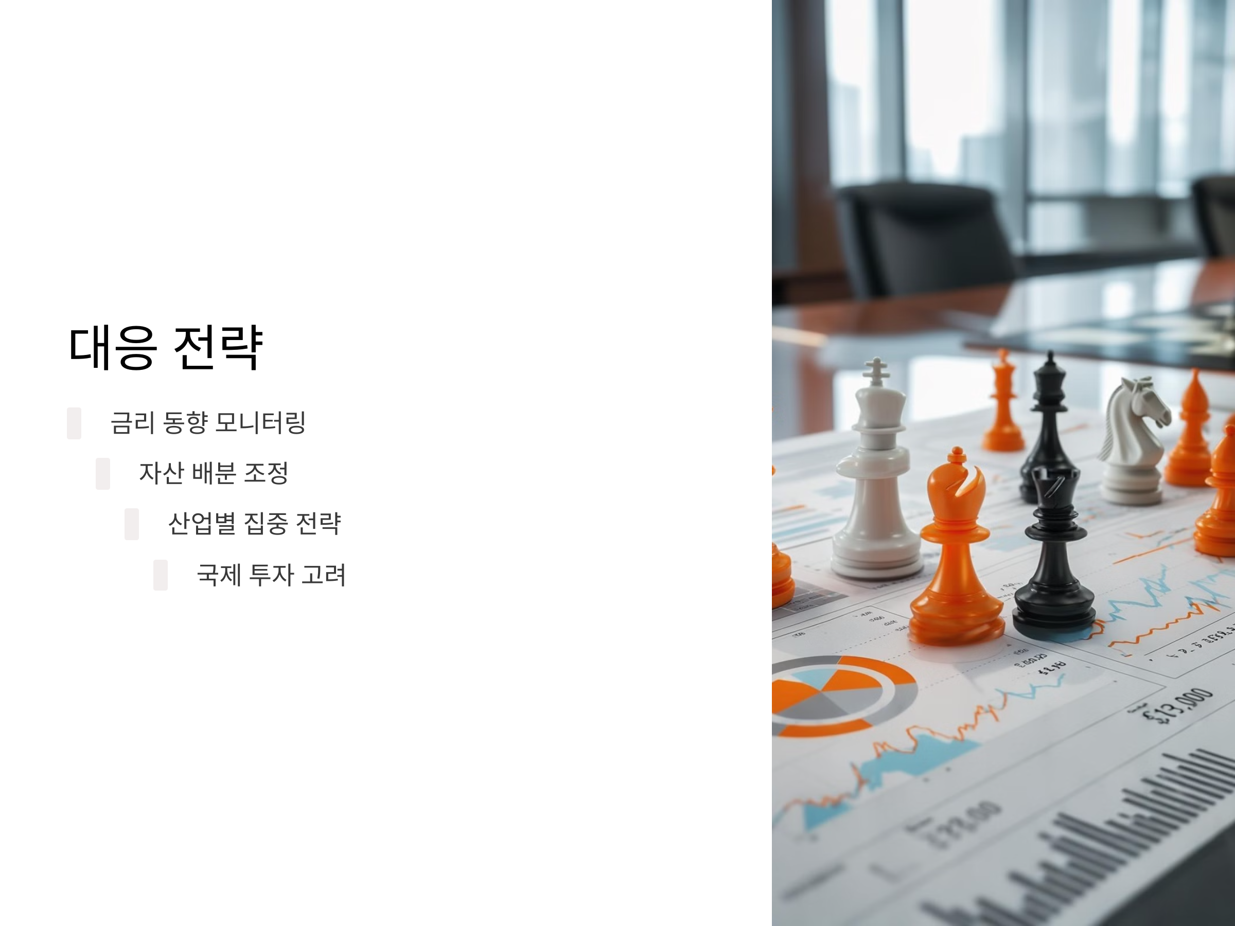 금리가 상승할 때는 안정적인 수익을 제공하는 필수 소비재나 헬스케어 같은 방어적 산업에 투자하는 것이 좋습니다. 또한, 금리 상승에 따른 자금 이동을 예측하여 고배당주나 채권형 자산을 고려할 수 있습니다.