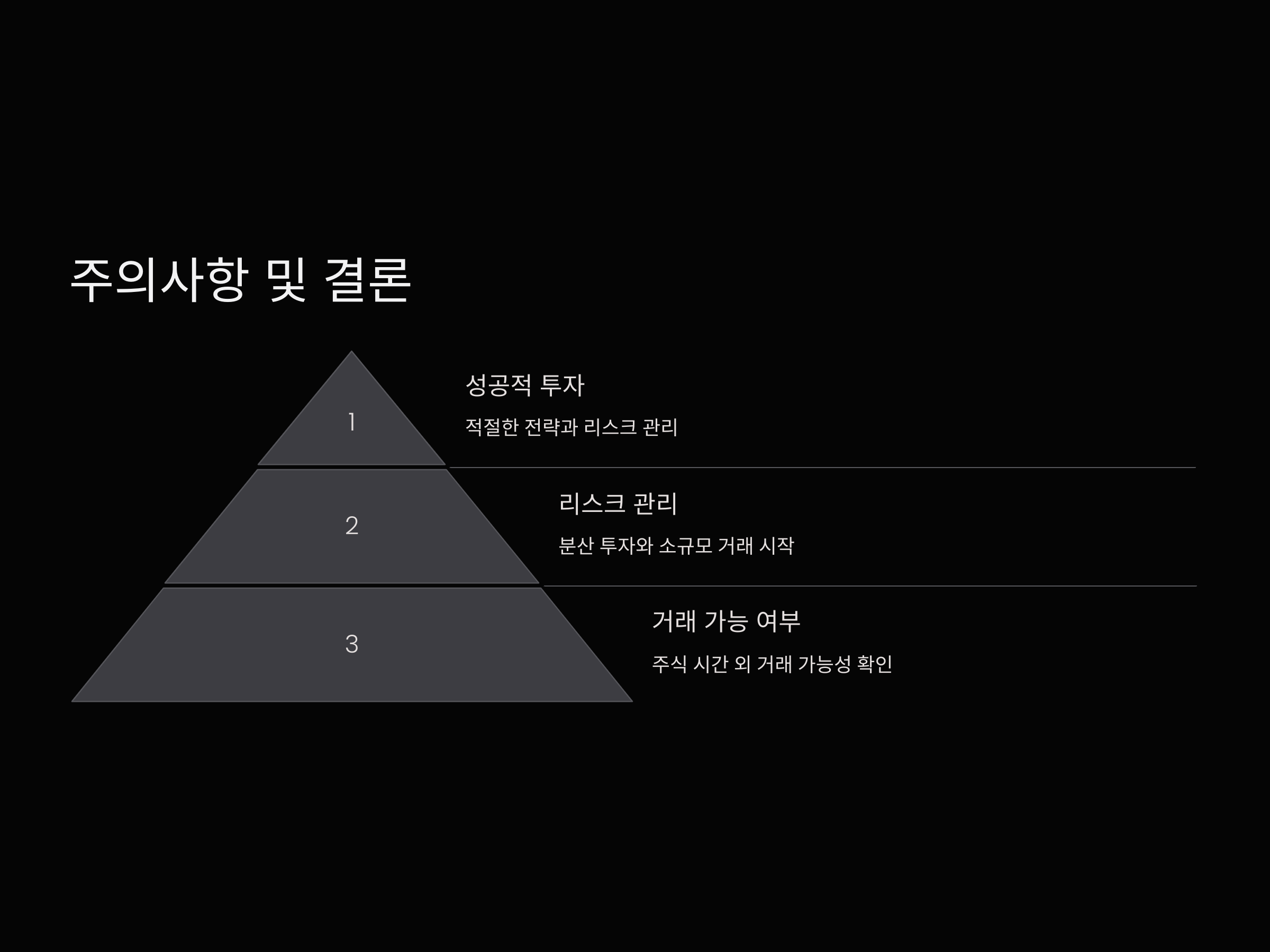 - 리스크 관리: 시간 외 거래에서는 가격 변동성이 크기 때문에, 적절한 리스크 관리가 필요합니다. 너무 많은 돈을 한 번에 투자하기보다는 분산 투자와 작은 규모로 거래를 시작하는 것이 좋습니다.