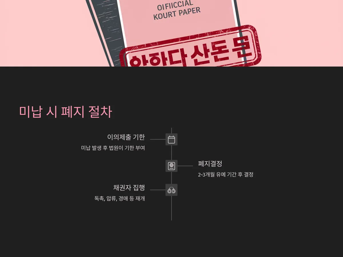 회생 절차 중 미납이 발생하면, 법원은 채무자에게 ‘이의제출 기한’을 부여합니다. 이때 특별한 사유나 소명 없이 미납이 지속되면 법원은 자동으로 ‘개인회생 절차 폐지결정’을 내리게 됩니다. 폐지결정이 확정되면, 채권자들은 독촉과 압류, 경매 등의 집행 절차를 재개할 수 있어 채무자는 다시 극심한 채무불이행 상태로 빠지게 됩니다.