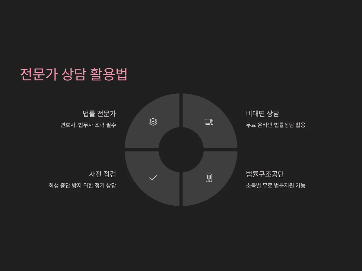 요즘은 비대면 무료 상담을 제공하는 법률기관도 많아, 부담 없이 상담을 받아볼 수 있습니다. 특히 법률구조공단에서는 소득에 따라 무료 법률지원을 받을 수 있으므로, 회생이 중단되지 않도록 사전 점검을 받아보는 것이 좋습니다.