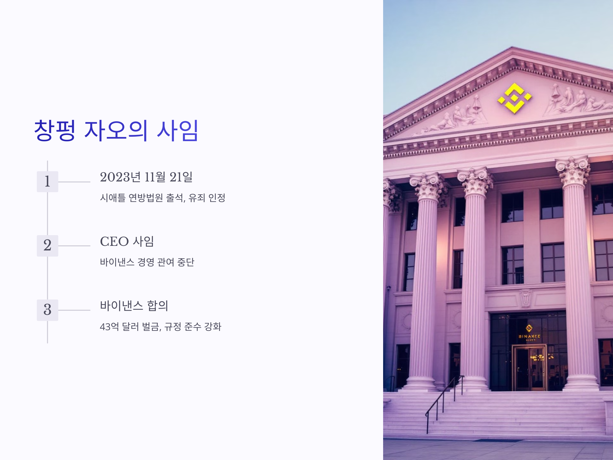 2023년 11월 21일, 창펑 자오는 시애틀 연방법원에 출석하여 유죄를 인정하고, 바이낸스 CEO직에서 물러났습니다. 그는 최대 주주 지위를 유지하지만, 회사 경영에는 관여하지 않기로 합의하였습니다. 또한, 바이낸스는 미국 재무부, 법무부, 상품선물거래위원회(CFTC)와의 합의에 따라 43억 달러(약 5조 7521억 원)의 벌금을 납부하고, 규정 준수 프로그램을 강화하며, 3년간 독립적인 모니터링 기관을 두기로 하였습니다. citeturn0search0