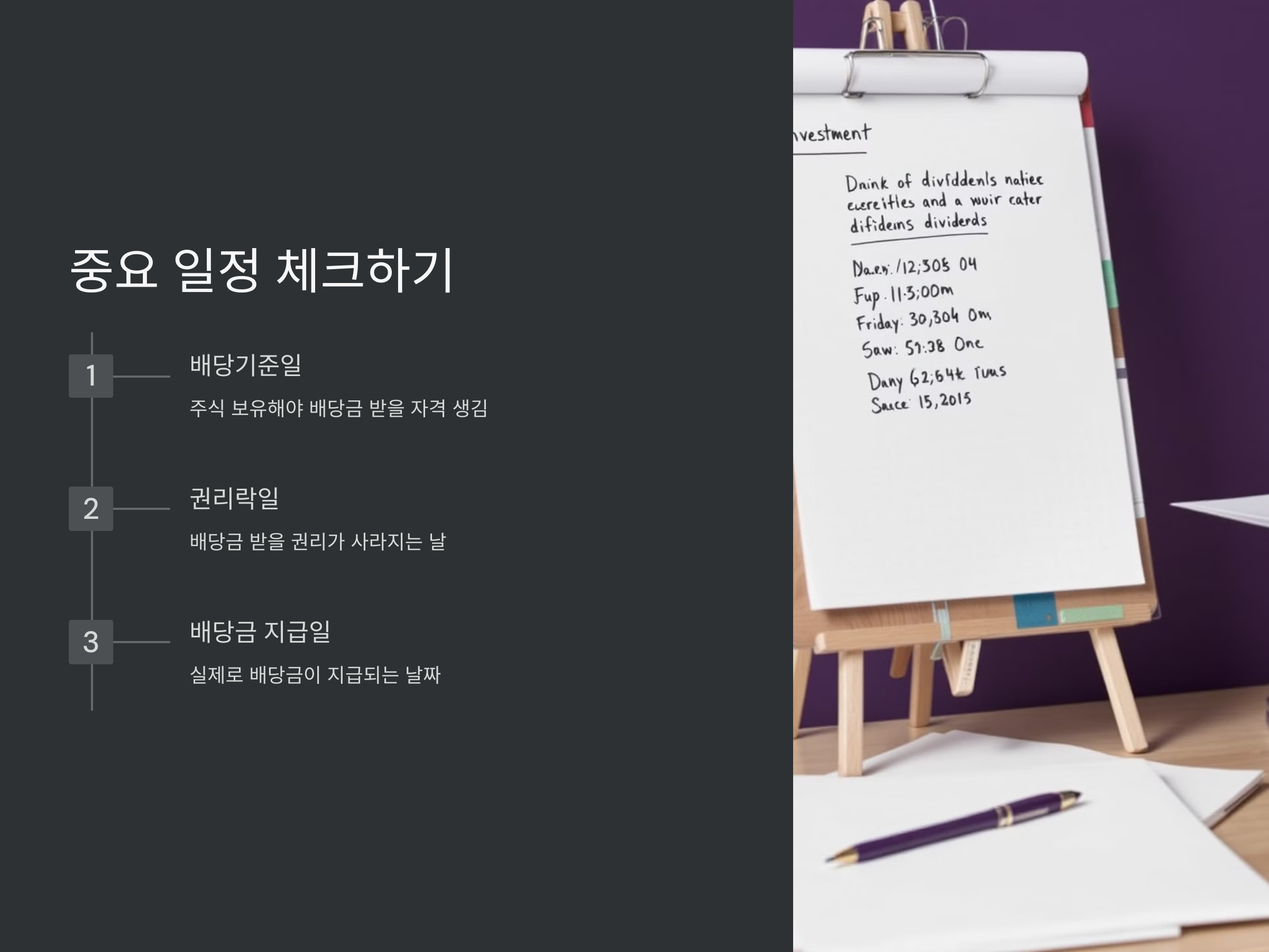 배당금을 받기 위한 중요한 날짜는 '배당기준일'과 '배당금 지급일'이 있으며, 이 두 날짜를 정확히 아는 것이 중요합니다. 배당기준일은 주식을 보유한 상태에서 배당금을 지급받을 수 있는 날짜를 의미하며, 배당금 지급일은 실제로 배당금이 지급되는 날짜입니다. 주식에 대한 권리가 발생하는 배당기준일 이전에 주식을 매수해야 배당금을 받을 수 있습니다.