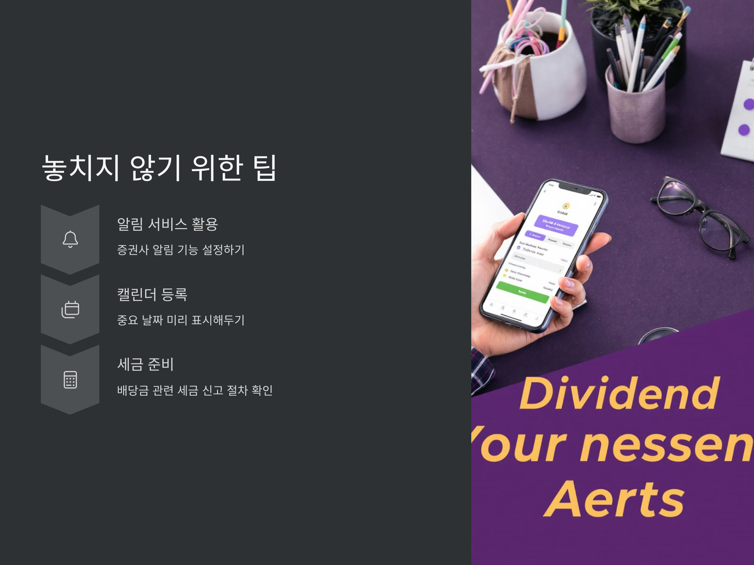 배당금을 받기 위해 중요한 것은 배당금 지급일을 정확히 확인하는 것입니다. 이를 놓치지 않기 위해 몇 가지 팁을 참고할 수 있습니다. 첫째, 증권사의 알림 서비스를 활용하여 배당금 지급일 전후로 알림을 받을 수 있습니다. 둘째, 주식 거래 플랫폼에서 해당 주식의 배당금 지급일을 미리 캘린더에 등록해두면, 자동으로 알림을 받을 수 있습니다.