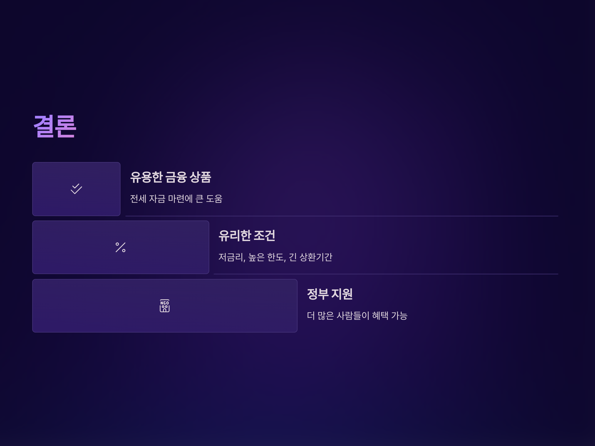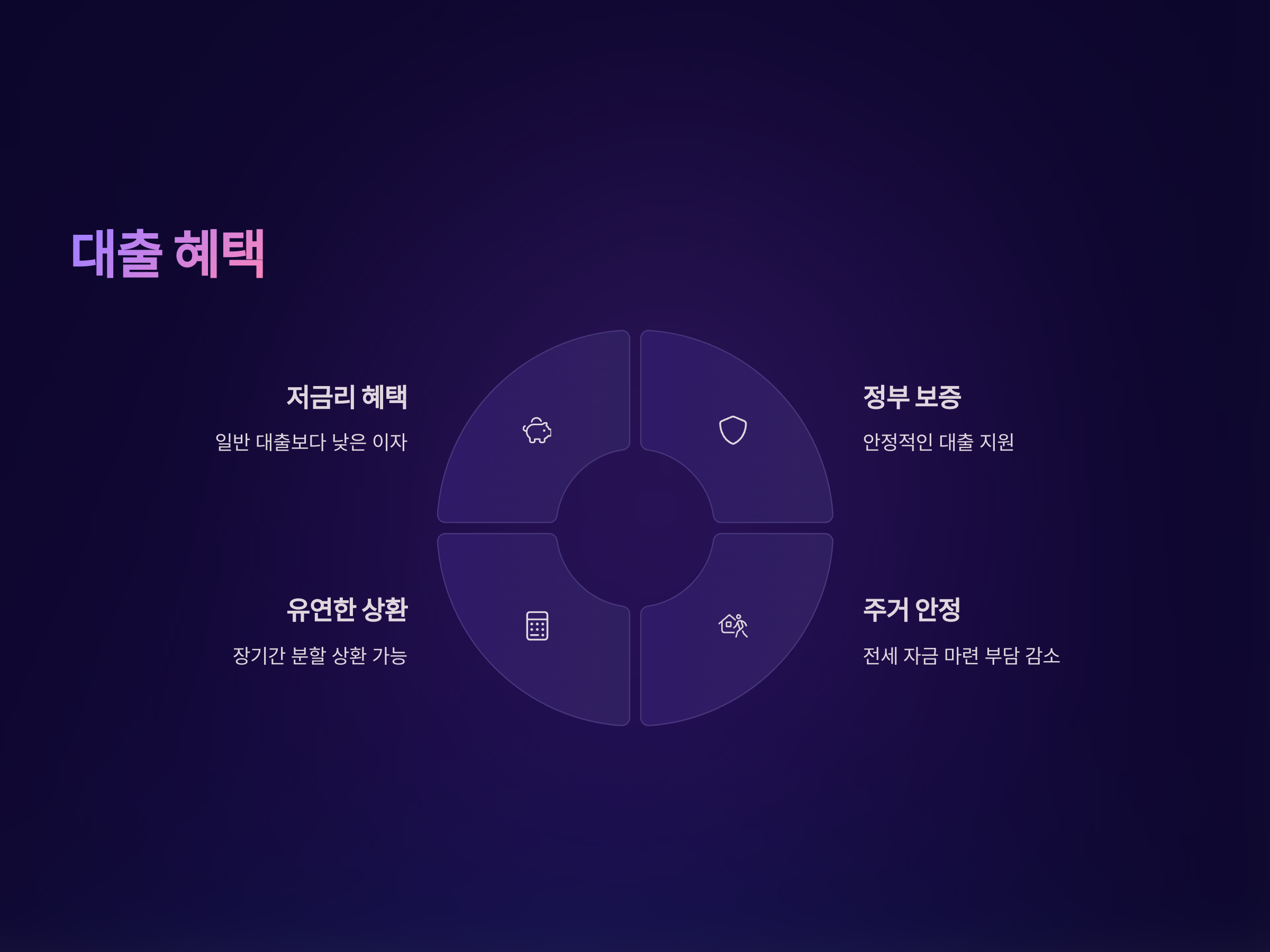 - 저금리: 정부가 보증하므로 일반적인 대출에 비해 금리가 낮습니다.