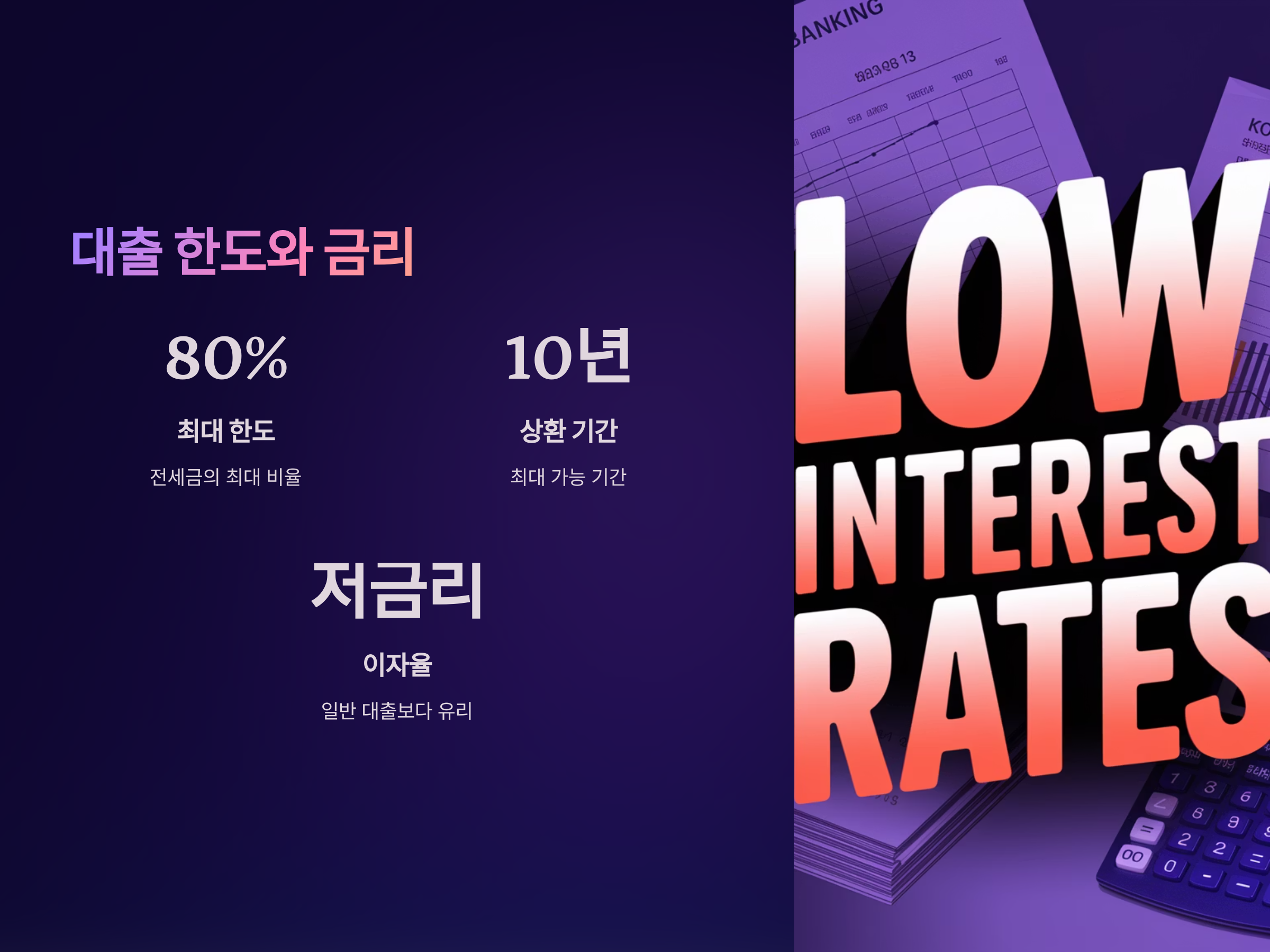 - 대출 한도: 전세금의 일정 비율까지 대출을 받을 수 있으며, 최근 한도도 확장되었습니다.