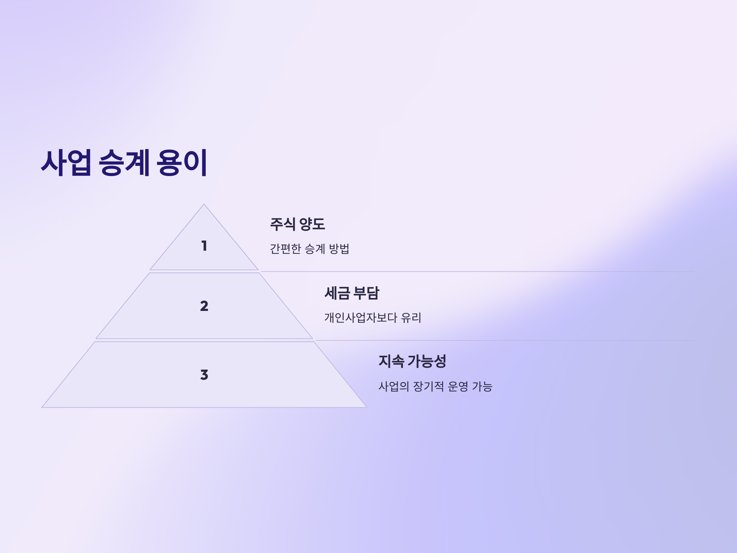 법인 사업체는 개인사업자보다 승계가 용이합니다. 특히, 세대가 바뀌면서 사업을 승계하려는 경우 법인이 더 유리한 구조를 가집니다. 법인으로 전환한 후에는 주식 양도나 자산 이전을 통해 간편하게 사업을 승계할 수 있습니다.