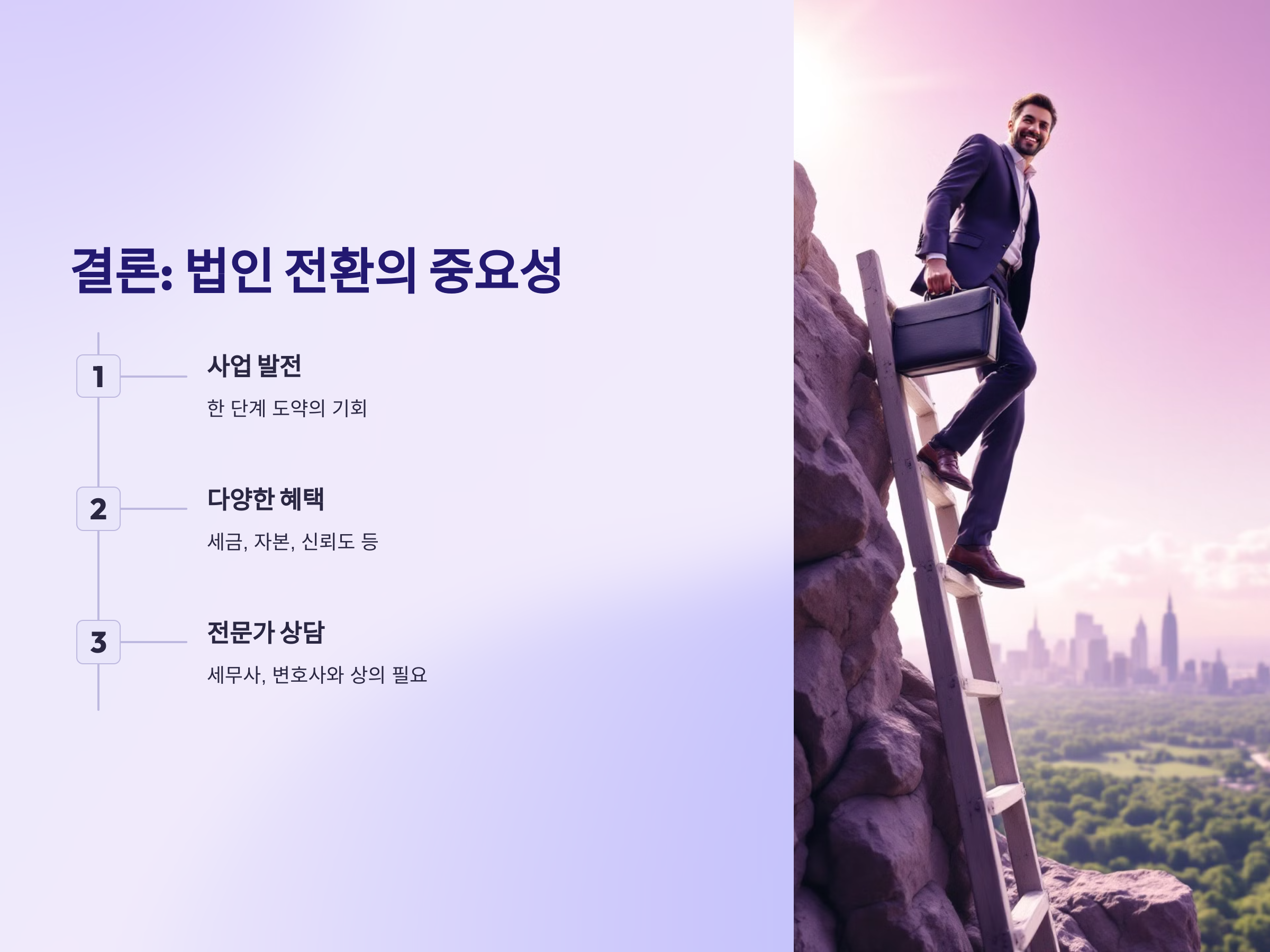 법인 전환은 사업 성장과 안정성을 위한 중요한 과정입니다. 이를 통해 얻을 수 있는 여러 가지 이점들을 고려해보시고, 본인의 사업에 가장 적합한 방향으로 법인 전환을 준비해 보세요.