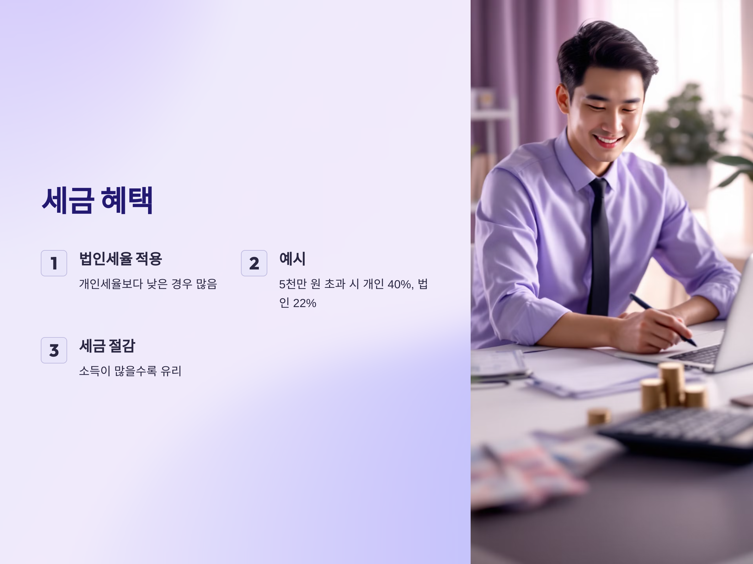 개인사업자는 사업 소득에 대해 개인세율을 적용받지만, 법인사업자는 법인세율이 적용됩니다. 이는 세금 측면에서 상당한 차이를 만들 수 있습니다. 특히, 소득이 많을 경우 법인세율이 개인세율보다 낮아 세금을 절감할 수 있습니다.