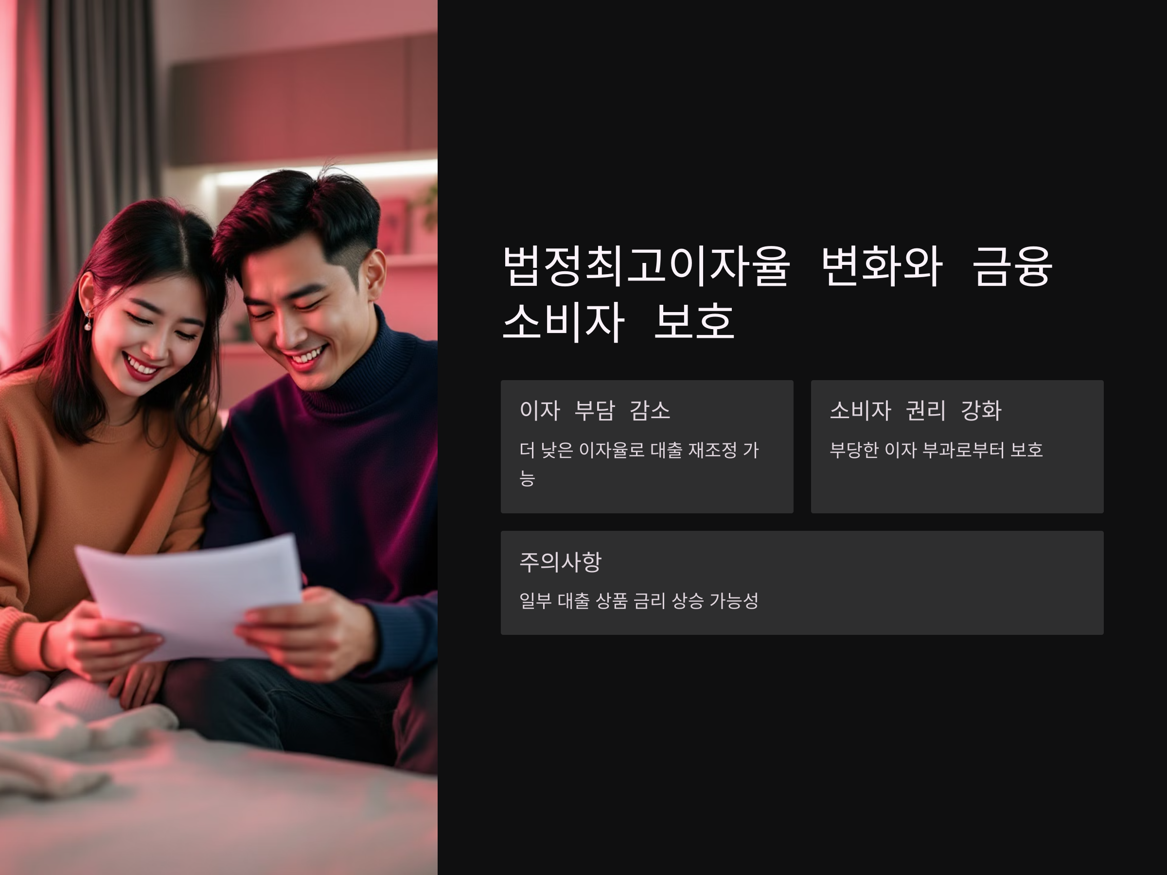 이러한 변화는 대출을 받은 사람들이 더 낮은 금리를 적용받을 수 있도록 도와줍니다. 예를 들어, 기존의 고금리 대출을 받은 경우, 새로운 법정최고이자율 적용에 따라 더 많은 금액을 상환할 필요 없이 이자 부담을 줄일 수 있습니다. 또한, 이는 과도한 이자 부과로부터 소비자를 보호하는 역할을 하여, 불법적인 고금리 대출을 방지하는 데 큰 기여를 하고 있습니다.