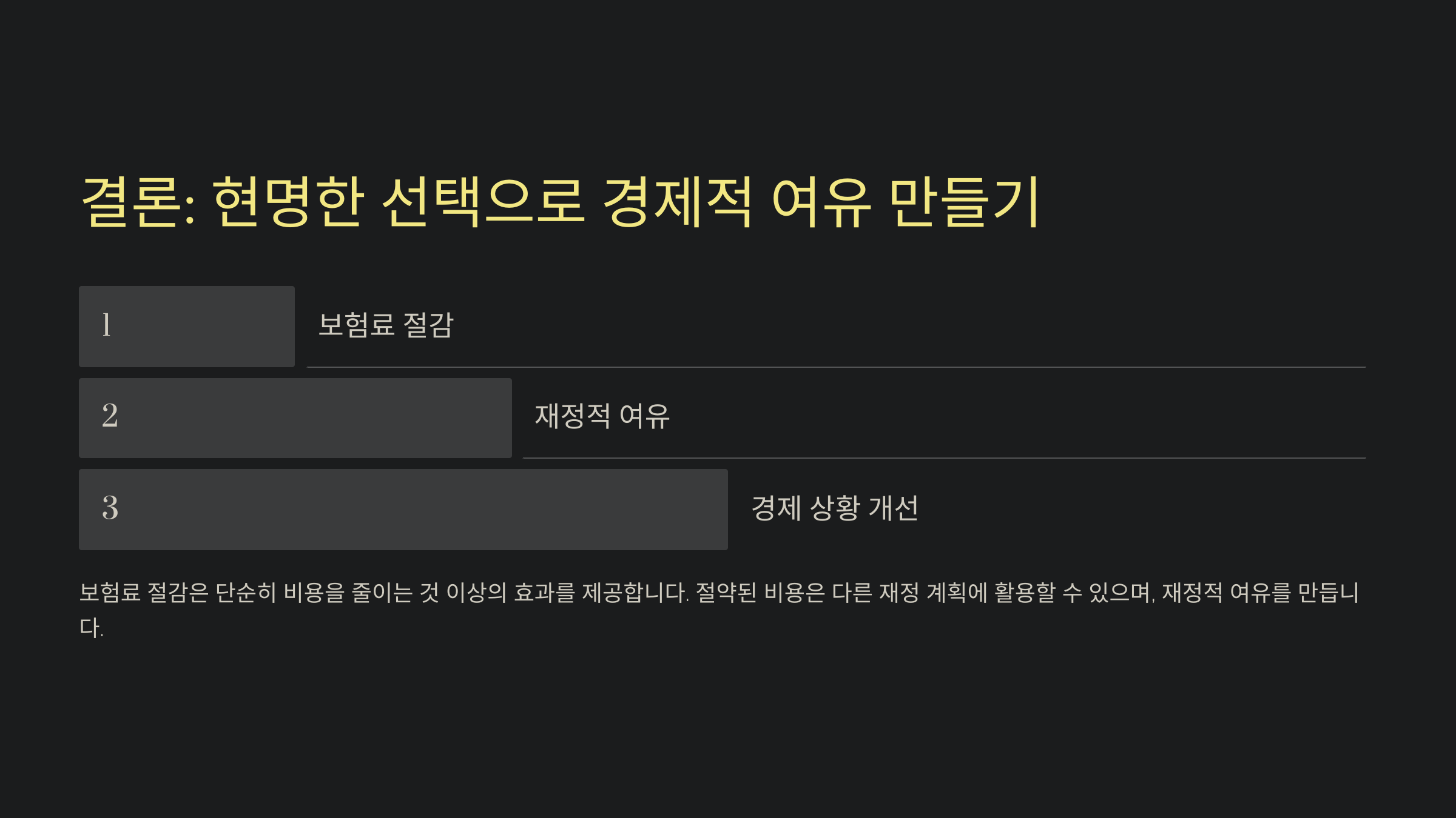 보험료 절감은 단순히 비용을 줄이는 것 이상의 효과를 제공합니다. 절약된 비용은 다른 재정 계획에 활용할 수 있으며, 재정적 여유를 만듭니다. 위의 전략을 실천해 보험료를 줄이고, 자신의 경제 상황에 적합한 보험 체계를 만들어 보세요.