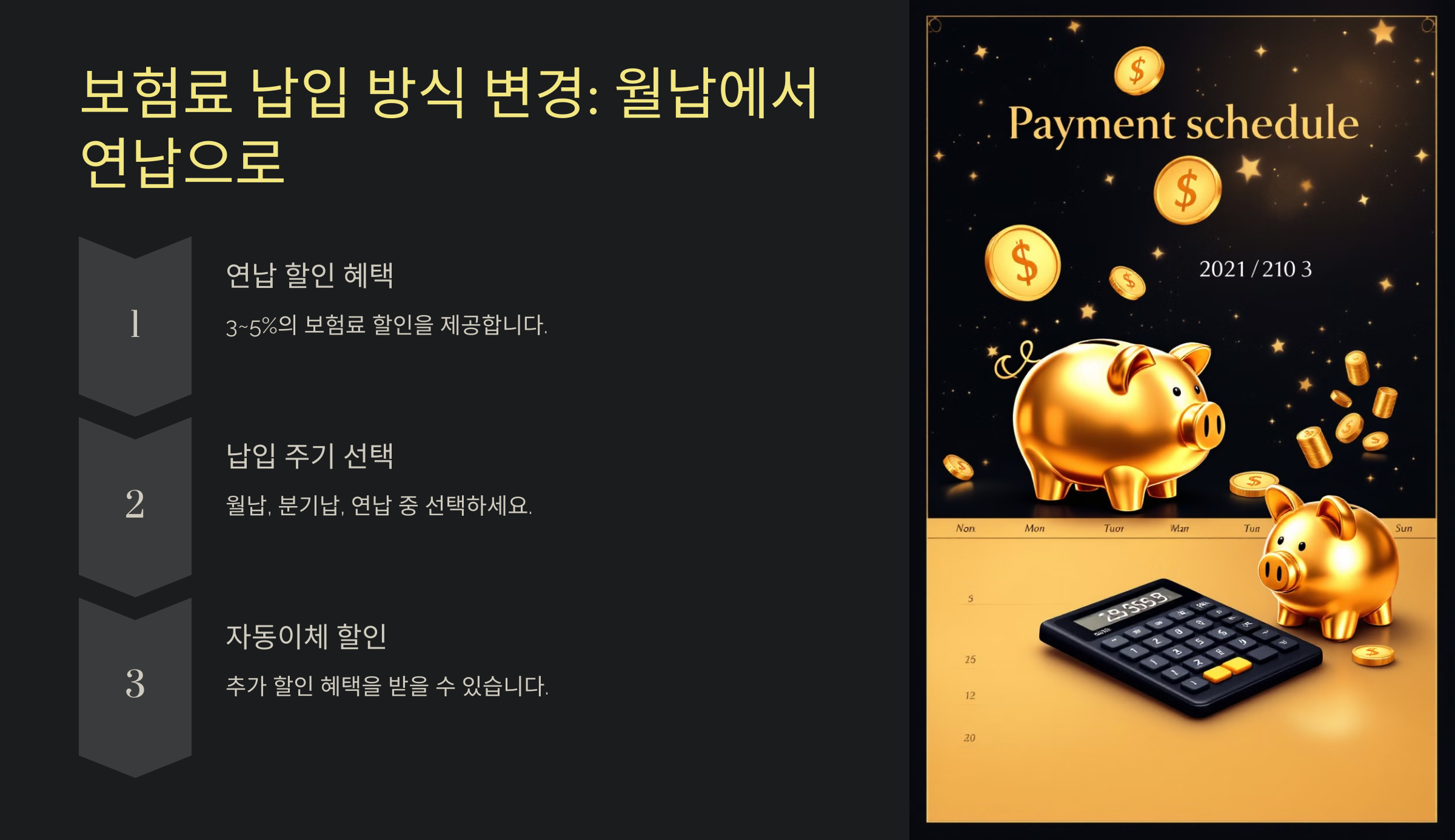 - 납입 주기 선택: 월납, 분기납, 연납 중 본인의 재정 상황에 맞는 방식을 선택하세요. 연납이 어렵다면 분기납으로도 절감 효과를 볼 수 있습니다.