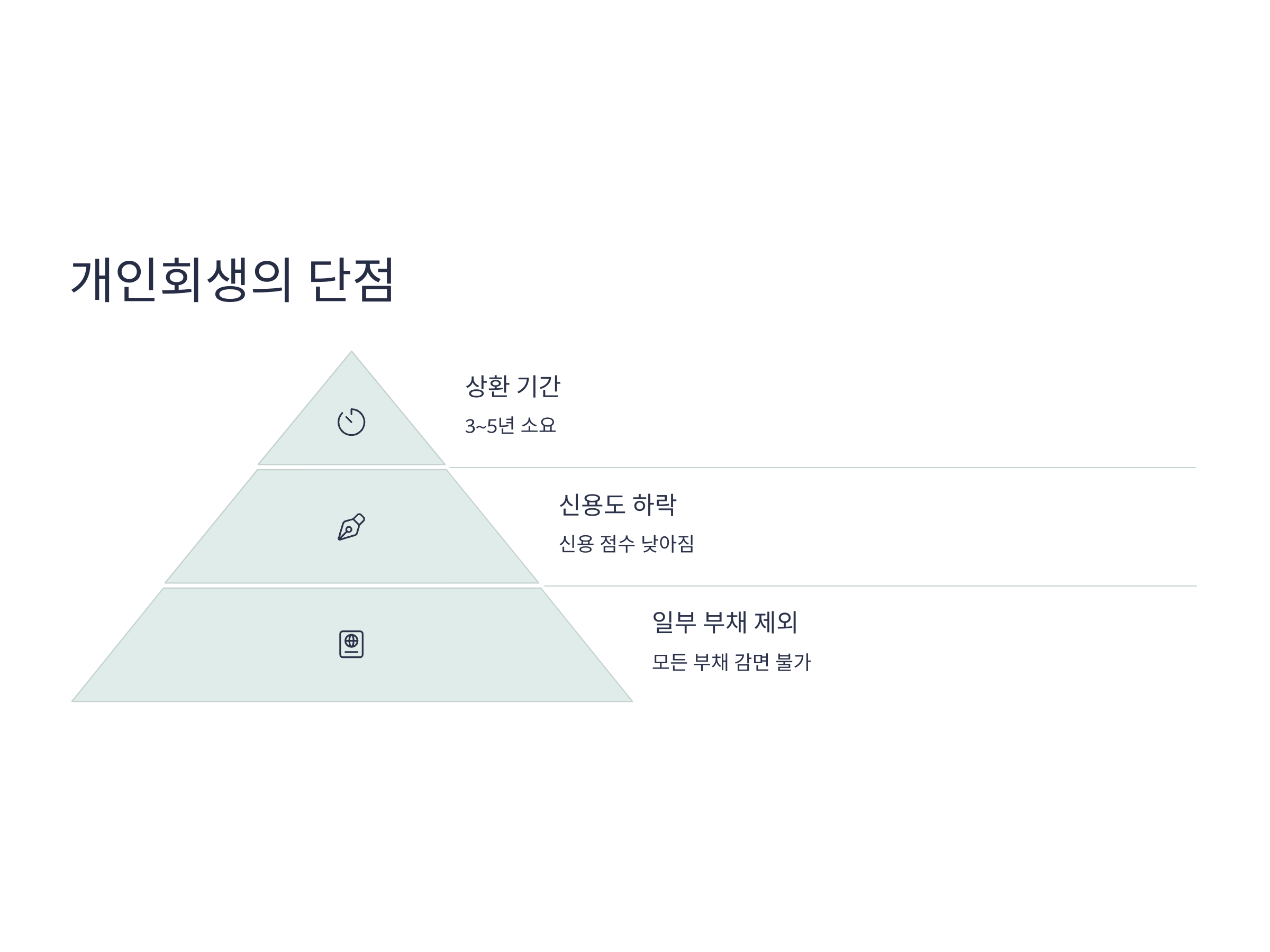- 신용도 하락: 개인회생이 끝날 때까지 신용 점수가 낮아질 수 있으며, 이는 향후 대출 등에 영향을 미칠 수 있습니다.