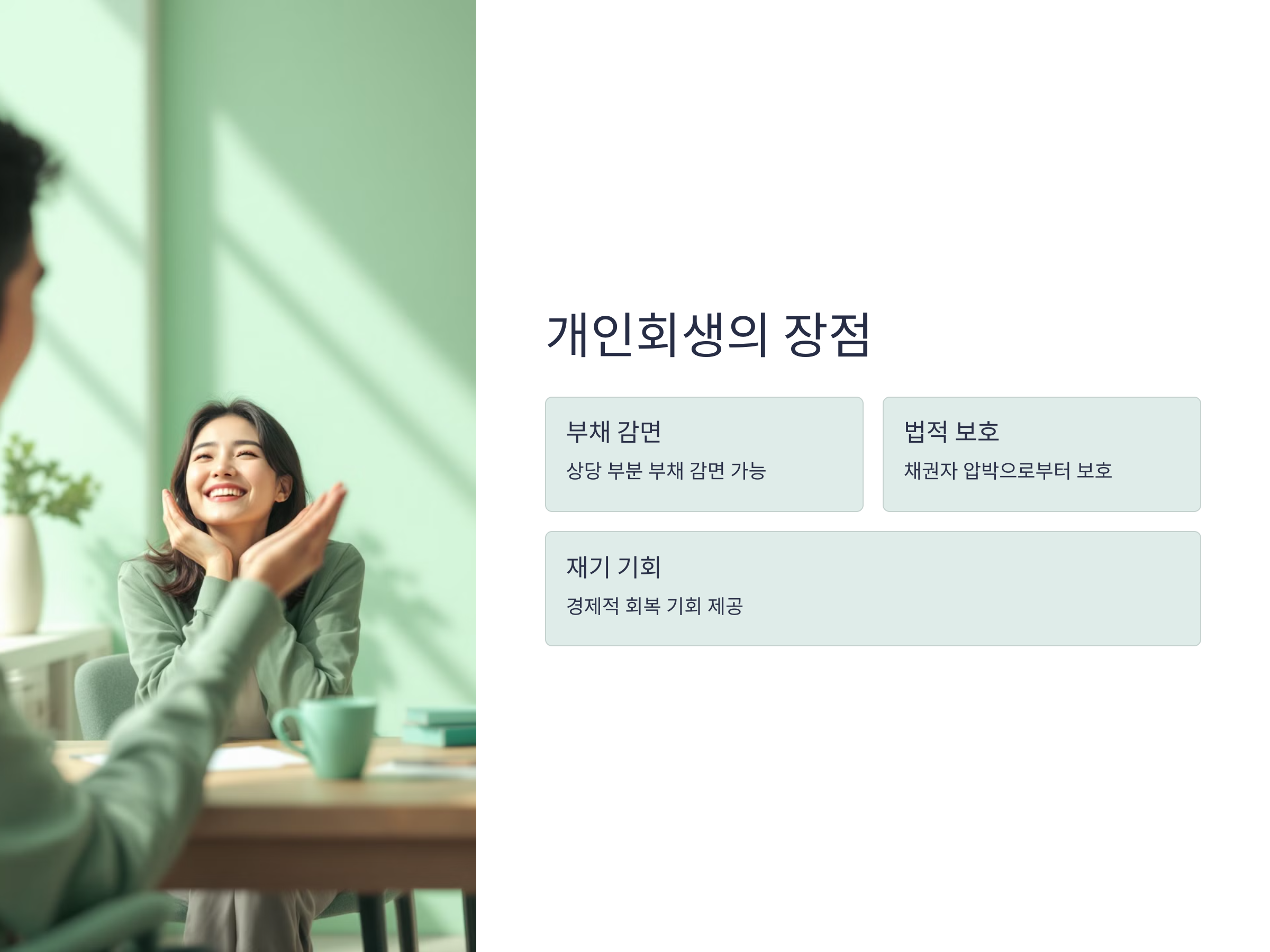 - 부채 감면: 개인회생 절차를 통해 많은 부채를 감면받을 수 있습니다.