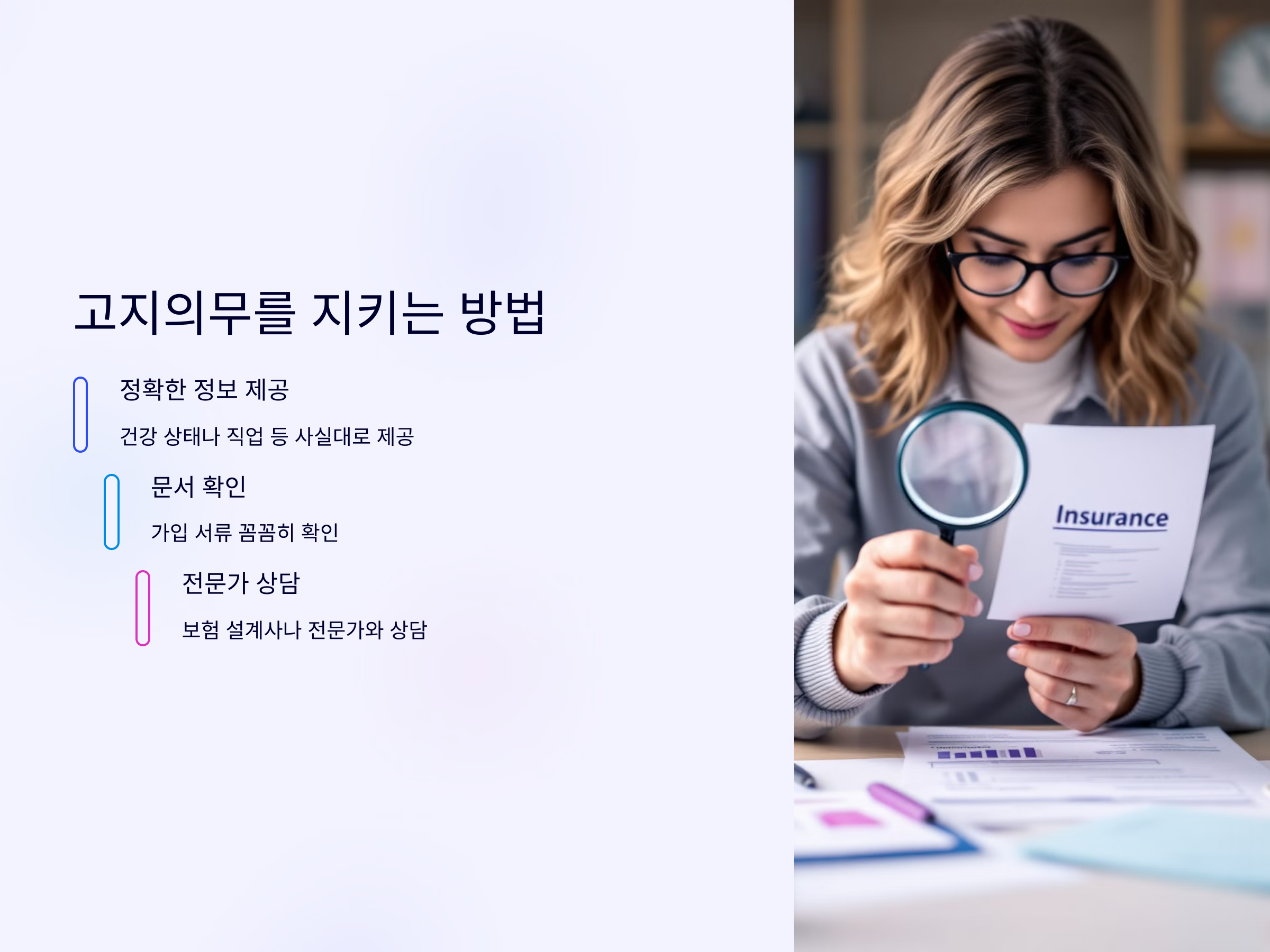 - 문서 확인: 보험 가입 시 작성한 서류를 꼼꼼히 확인하여 잘못된 정보가 없는지 확인해야 합니다.