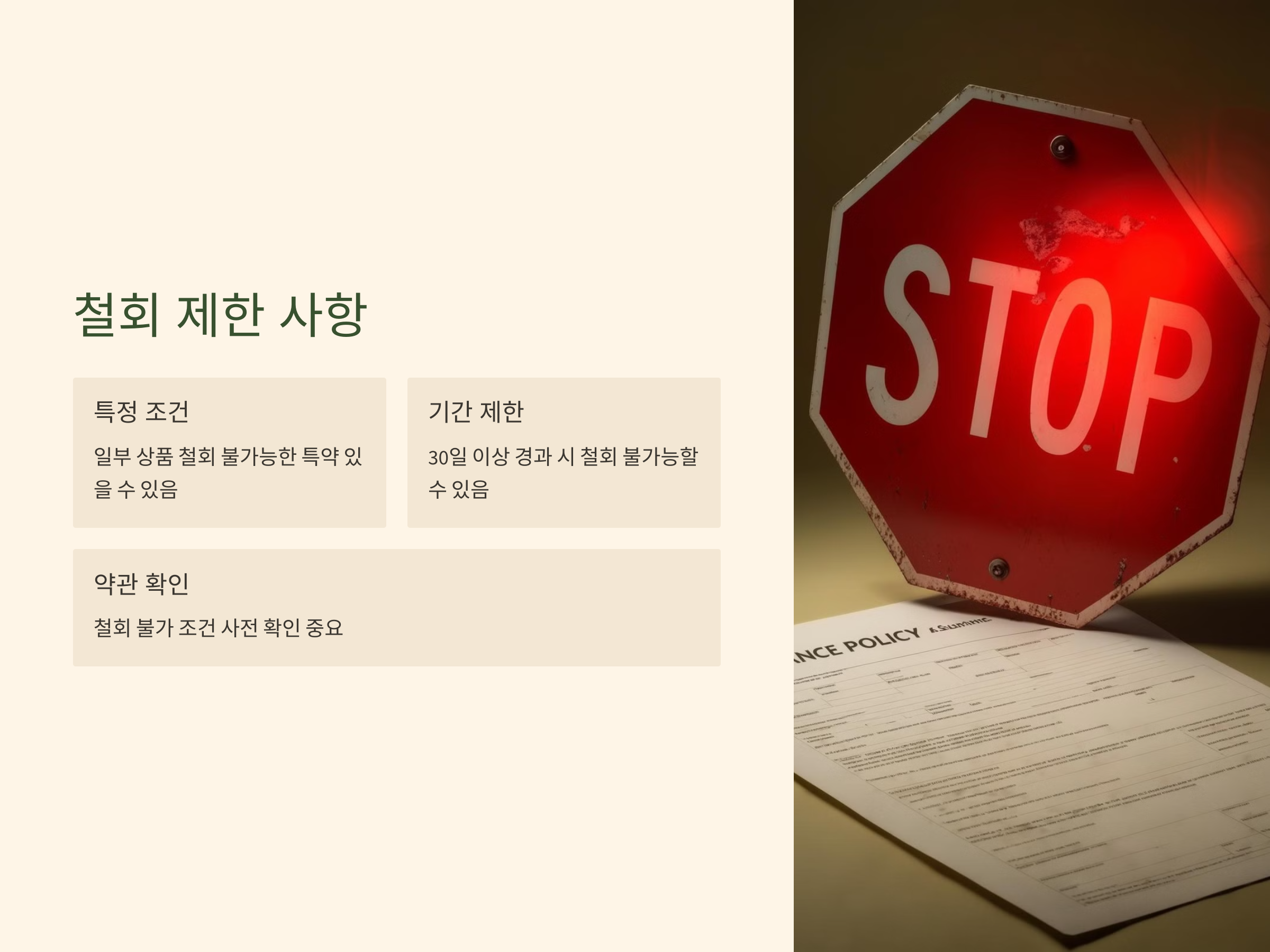 일부 보험 상품에서는 가입자에게 보험 철회가 불가능한 특약이 추가될 수 있습니다. 예를 들어, 보험상품의 일부 특약이 적용되는 경우, 철회할 수 없는 조건이 붙을 수 있으므로 약관을 미리 꼼꼼히 확인하는 것이 중요합니다.