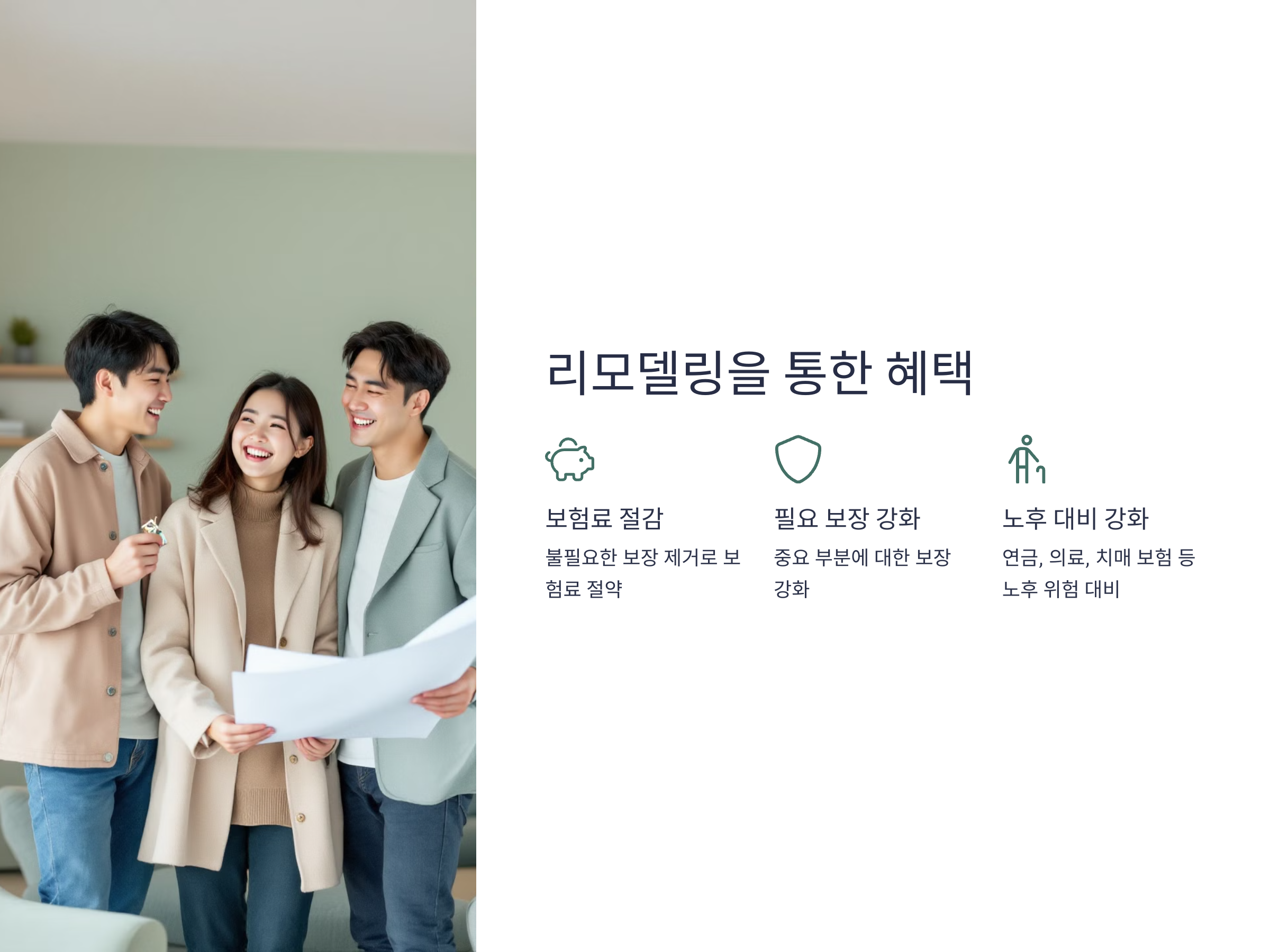보험 리모델링은 기존의 보험 가입 내역을 점검하고, 현재의 상황에 맞게 다시 설계하는 과정을 말합니다. 과거에 가입한 보험이 현재의 나에게 맞지 않을 수 있기 때문에, 리모델링을 통해 불필요한 보장을 줄이고 필요한 보장은 늘려 더 효율적인 구조로 바꿀 수 있습니다. 예를 들어, 자녀가 있는 가구는 자녀 교육비나 의료비 관련 보장을 강화할 수 있고, 나이가 많아진다면 노후 대비를 더 철저하게 할 수 있습니다. 또한, 보험료를 절약하면서도 더 좋은 보장을 받을 수 있는 기회가 될 수 있습니다.