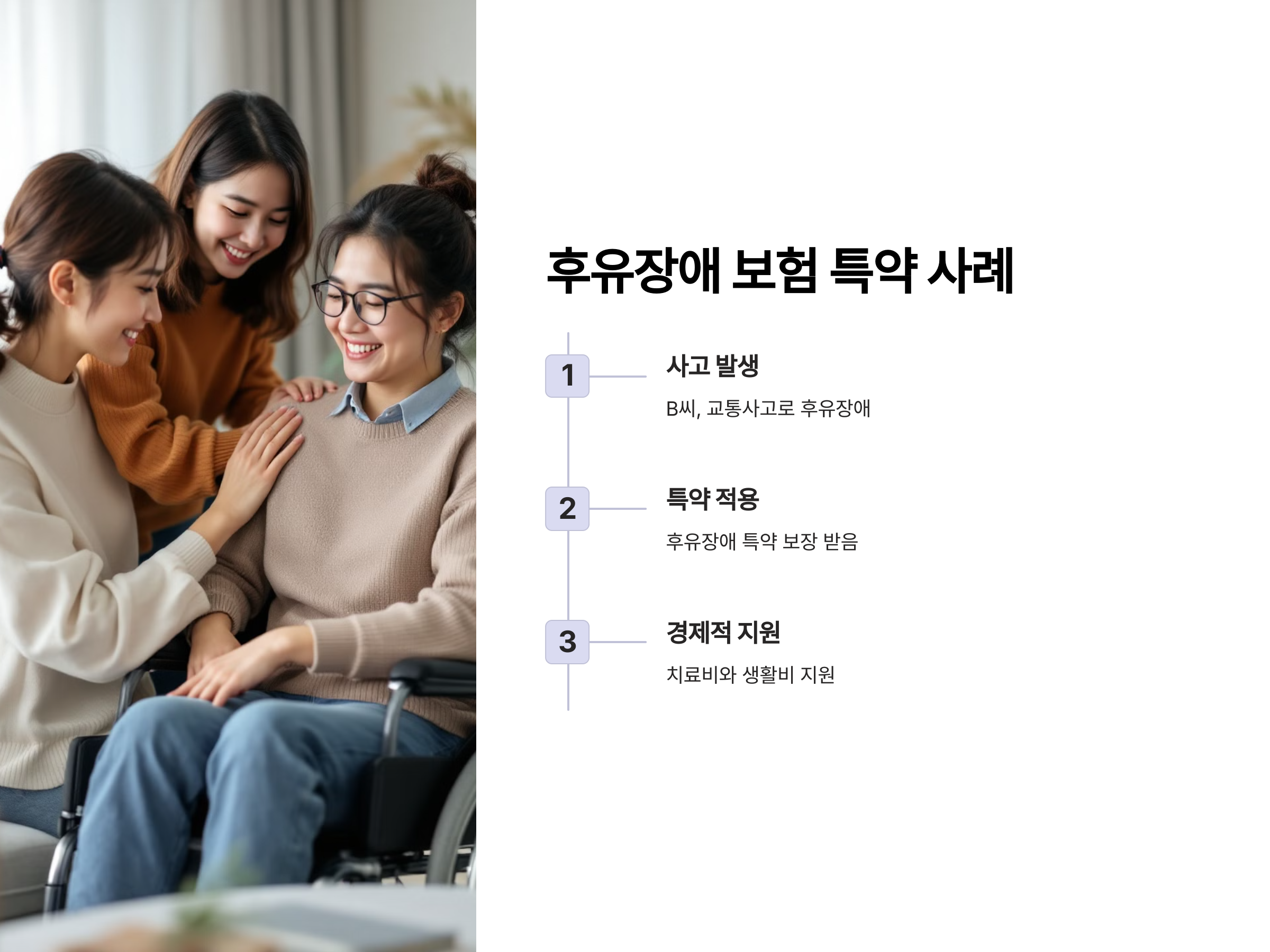 B씨는 교통사고로 인해 후유장애를 겪은 사례입니다. B씨는 기본적인 건강보험에 후유장애 특약을 추가로 가입했기 때문에 사고 후 장애로 인한 치료비와 생활비를 보장받을 수 있었습니다. 이 특약은 사고나 질병으로 인한 후유장애를 겪을 경우, 일상생활에 필요한 비용을 지원해주기 때문에 경제적 어려움을 줄여줍니다.