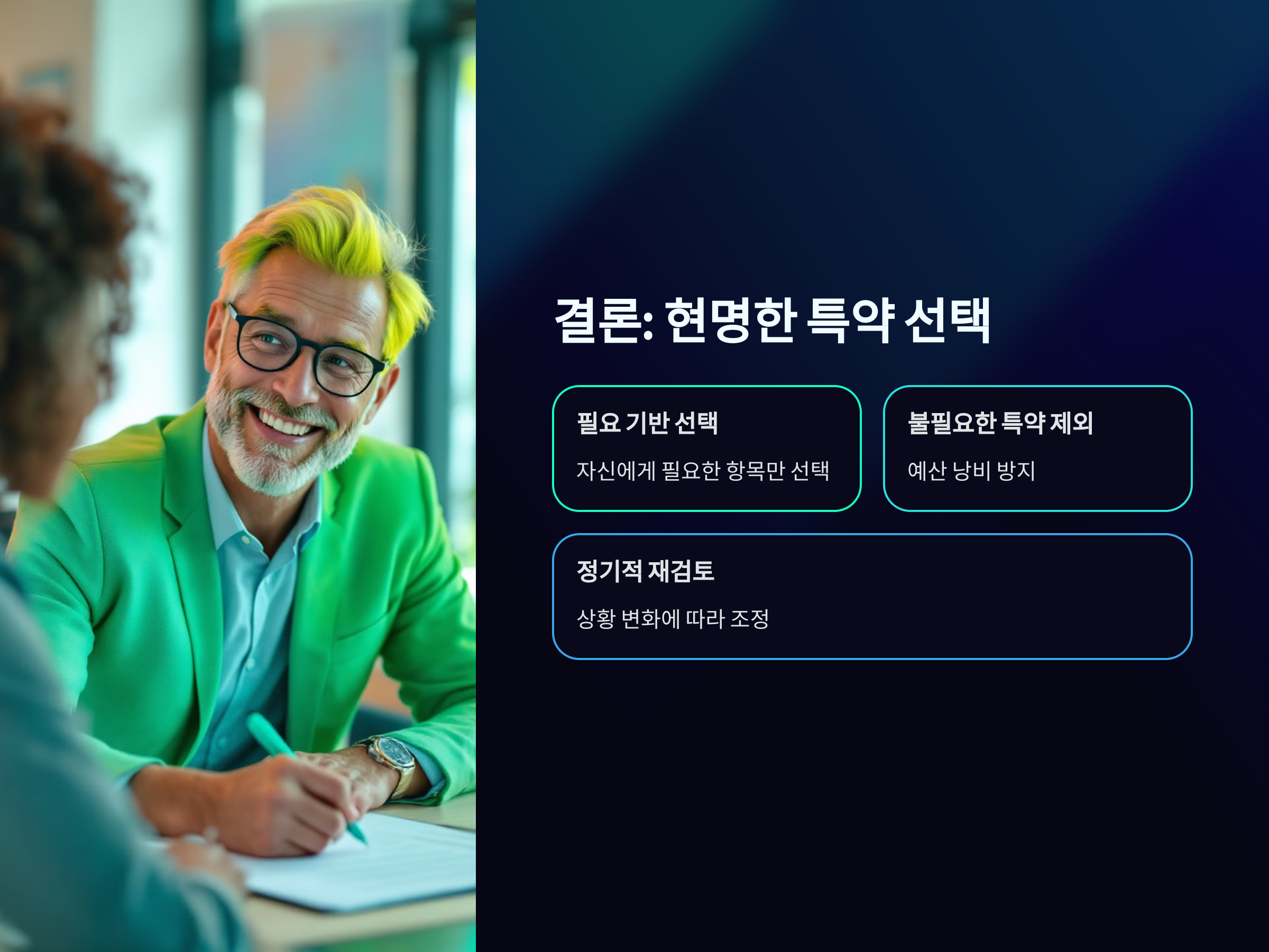 - 장기적인 관점: 보험 특약을 선택할 때, 현재의 상황뿐만 아니라 미래의 변화에 따른 필요성도 고려해야 합니다. 예를 들어, 나이가 들면서 필요한 보장 항목이 달라질 수 있습니다.