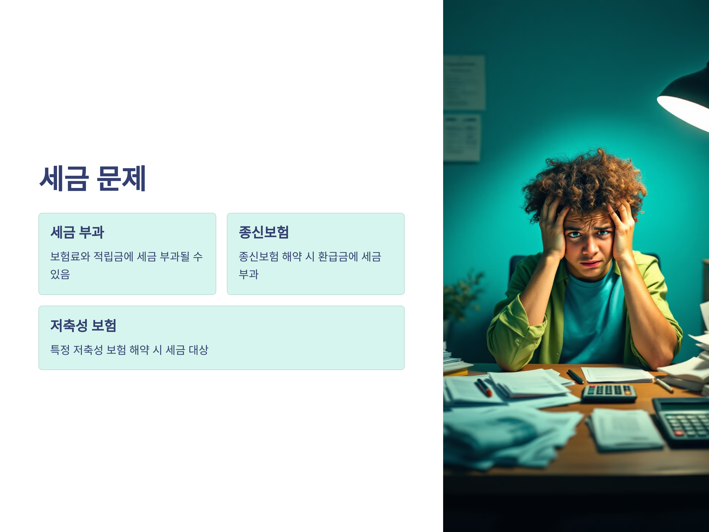 보험을 해약하면 세금 문제가 발생할 수 있습니다. 특히, 일부 보험은 해약 시에 보험료와 적립금에 대해 세금을 부과하는 경우가 있습니다. 예를 들어, 종신보험이나 특정 저축성 보험의 경우, 해약 시 환급금이 세금 부과 대상이 될 수 있습니다.