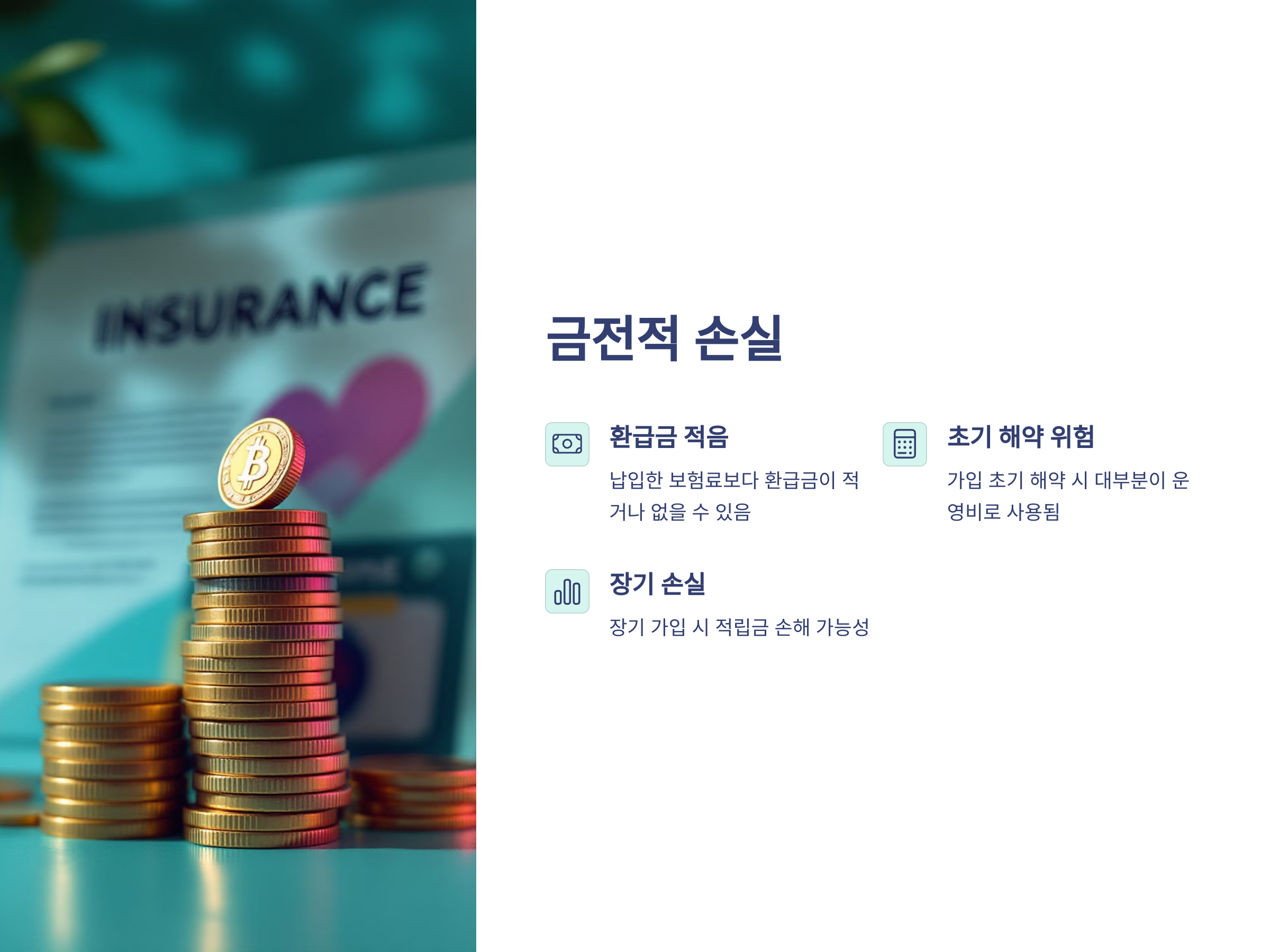 보험 해약 후 가장 큰 불이익 중 하나는 바로 금전적 손실입니다. 많은 사람들이 해약 시점에서 보험금을 지급받을 것이라고 예상하지만, 실제로는 납입한 보험료보다 환급금이 적거나 전혀 지급되지 않는 경우도 있습니다. 특히, 보험 가입 초기 몇 년 동안은 보험료의 대부분이 보험 회사의 운영 비용으로 사용되기 때문에 해약 시 돌려받는 금액이 적을 수 있습니다.