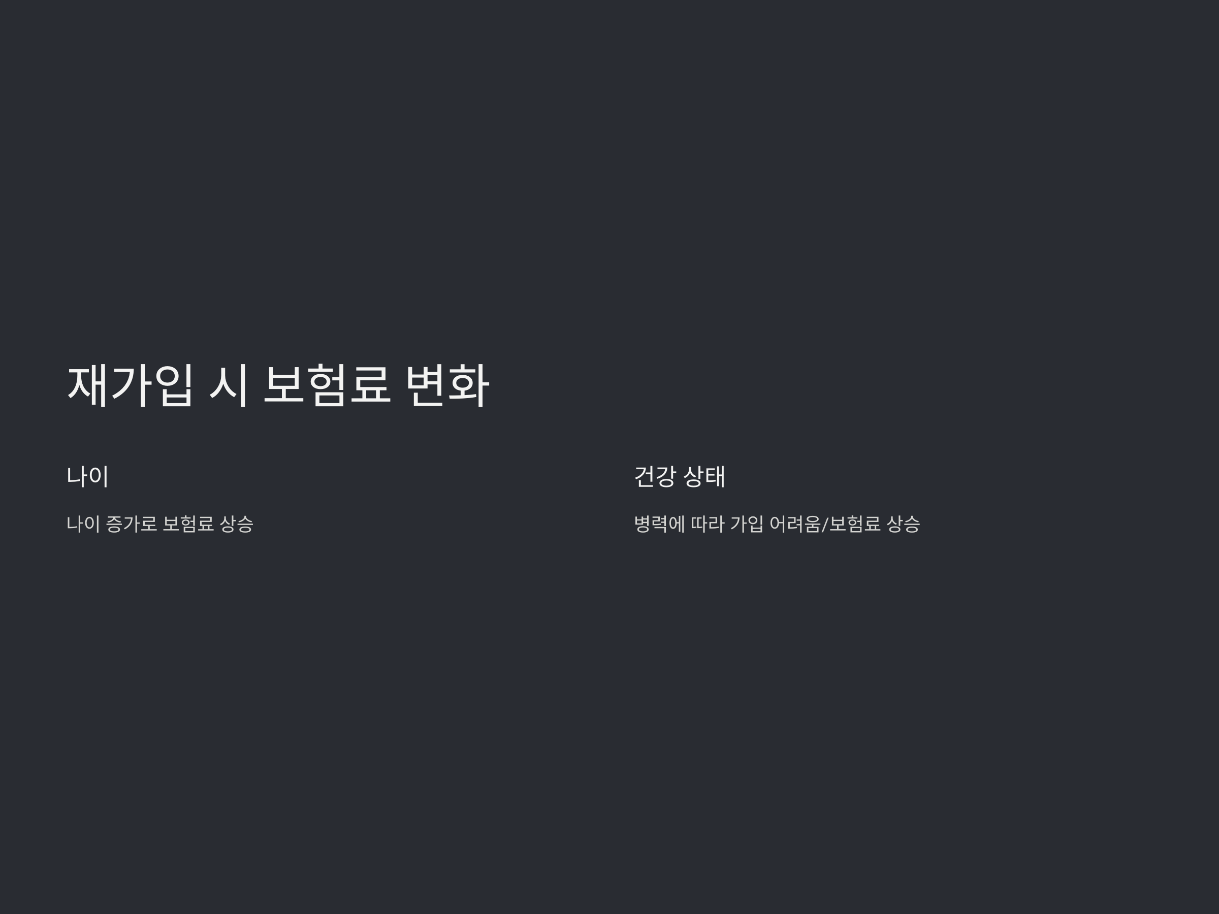 보험 해지 후 재가입 시 보험료는 상황에 따라 크게 달라질 수 있습니다. 보험료가 오를 수 있는 이유는 크게 두 가지로 나눠집니다.