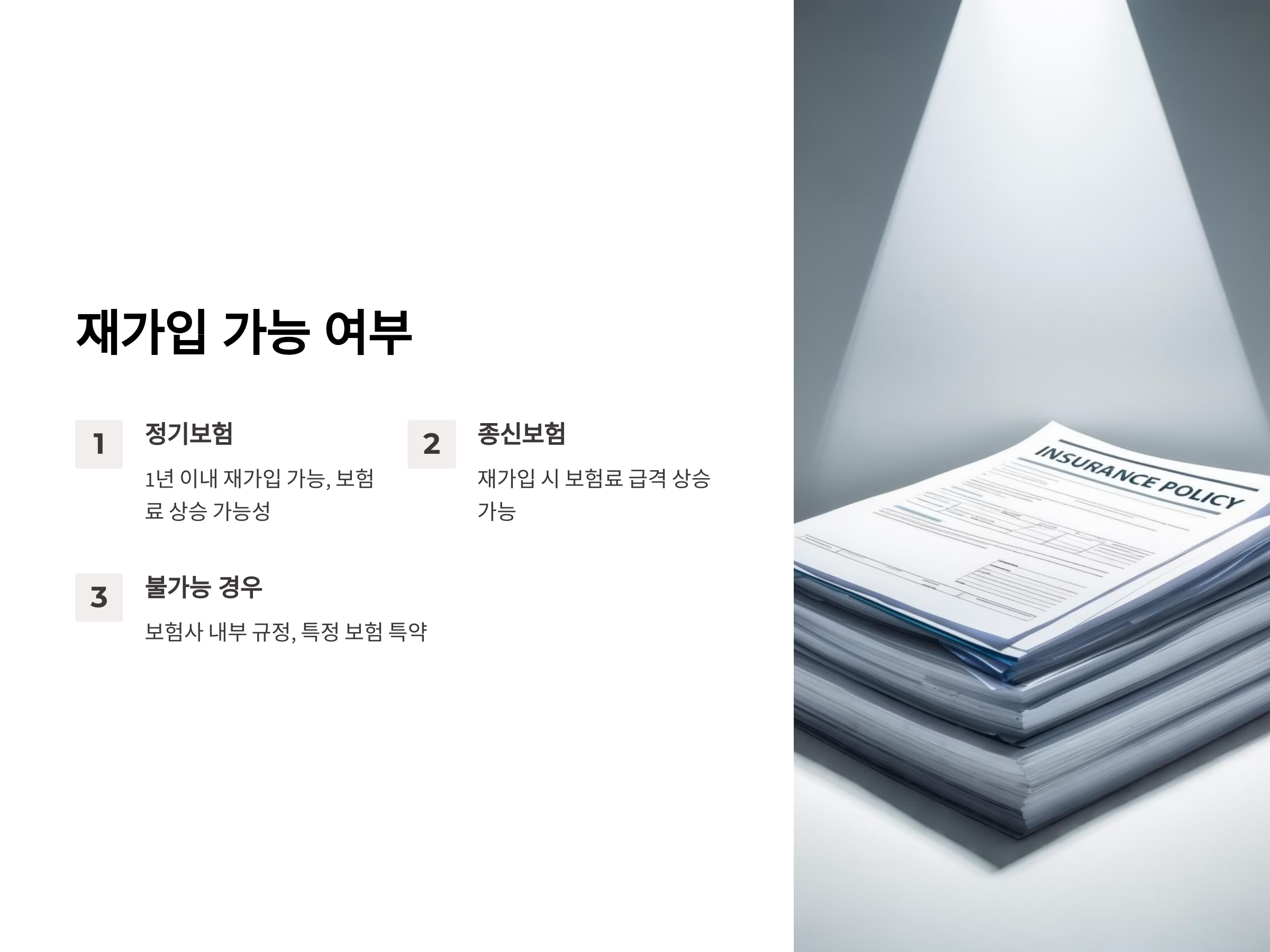 보험 해지 후 재가입 시에는 몇 가지 중요한 점을 유의해야 합니다. 이를 미리 알고 준비하면, 불필요한 비용이나 불편을 최소화할 수 있습니다.
