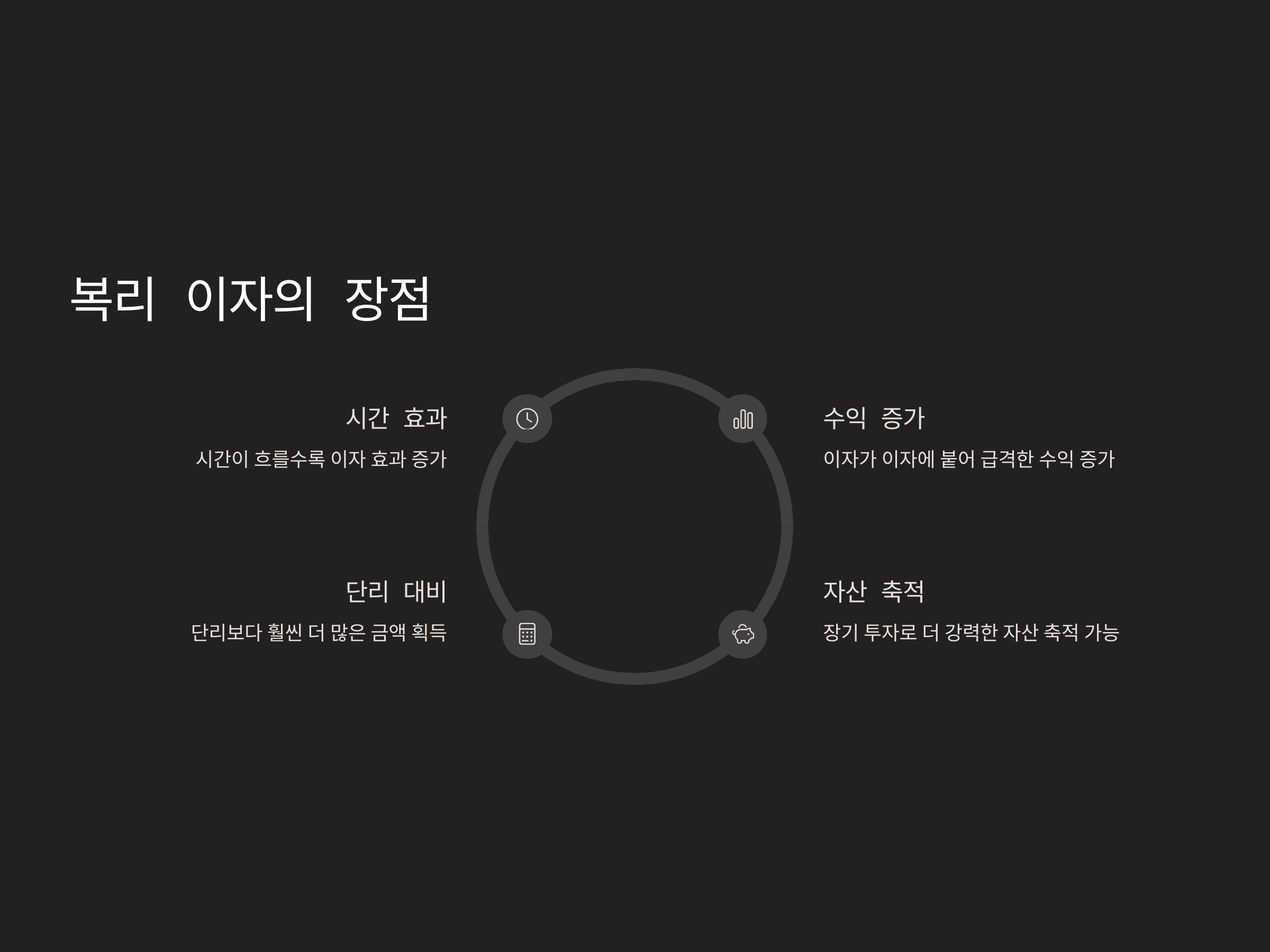 복리 이자의 가장 큰 장점은 시간에 따라 이자 효과가 커진다는 점입니다. 초기에는 그 효과가 작지만, 시간이 흐를수록 이자가 이자에 붙는 구조로 인해 수익이 급격히 증가합니다. 예를 들어, 10년, 20년을 투자하면 복리 효과는 그만큼 더 커져 투자한 금액에 비례하는 수익을 얻을 수 있습니다.