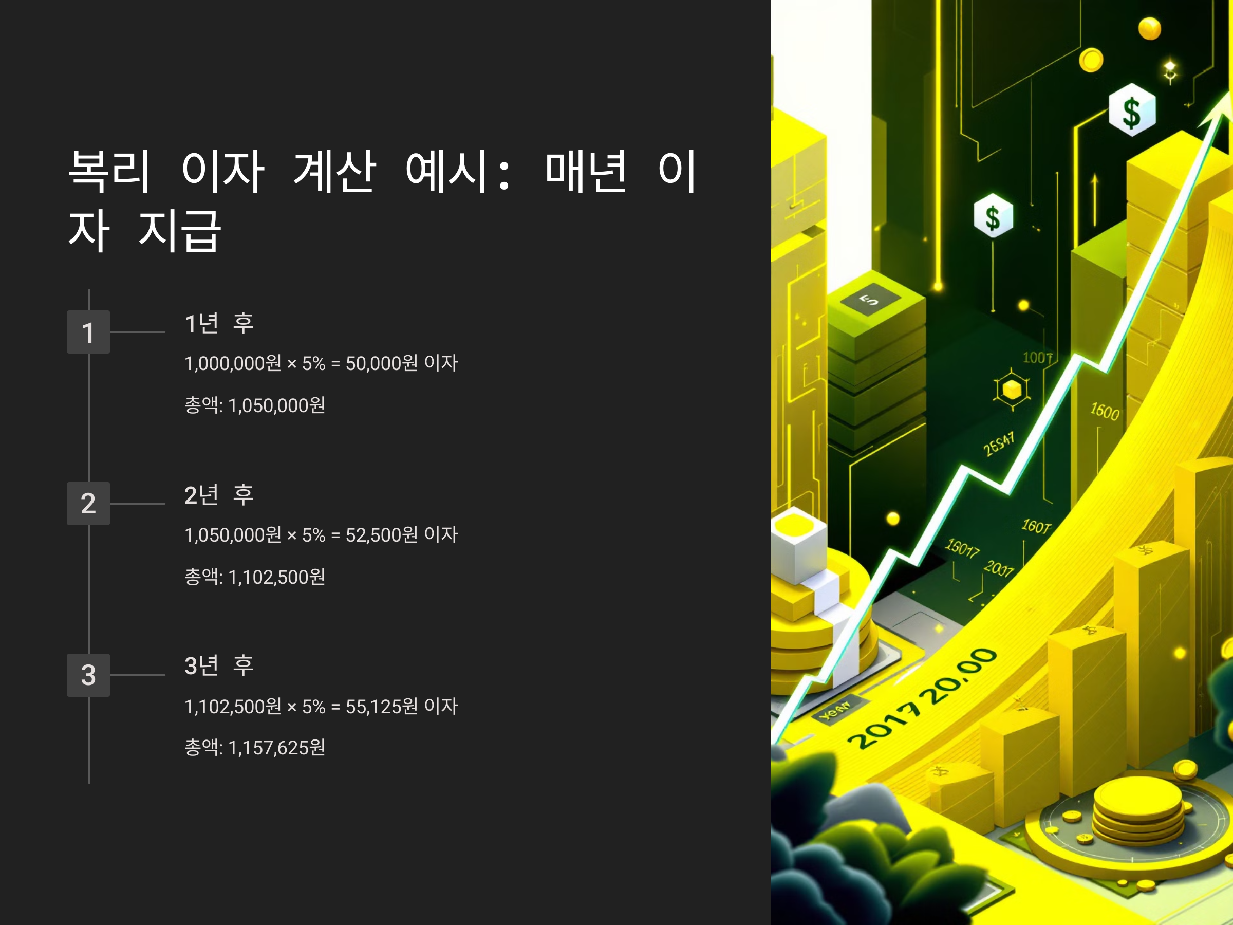복리 이자 계산법을 쉽게 이해할 수 있는 예시를 들어보겠습니다. 1,000,000원의 원금을 연 5% 이자율로 3년 동안 복리로 계산하는 경우를 가정해 보겠습니다. 매년 이자가 지급되는 경우, 이자는 다음과 같이 계산됩니다.
