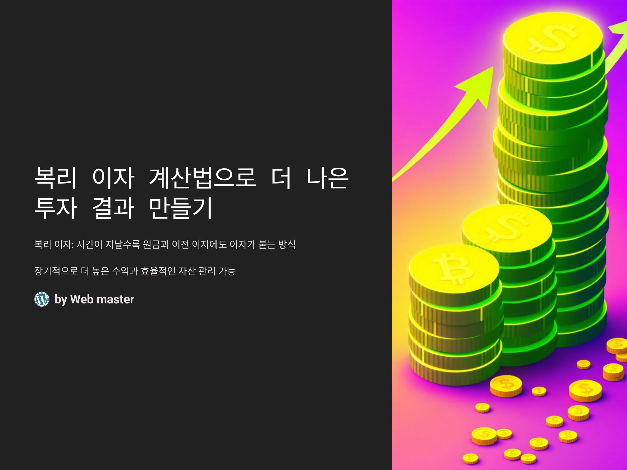 복리 이자 계산법은 시간이 지날수록 원금뿐만 아니라 이전에 붙은 이자에도 이자가 붙는 방식입니다. 이를 통해 수익을 극대화할 수 있습니다. 복리 이자 계산법을 정확하게 이해하면 장기적으로 더 높은 수익을 얻을 수 있고, 자산을 효율적으로 관리할 수 있게 됩니다. 이번 포스팅에서는 복리 이자 계산법을 쉽게 풀어 설명하고, 실제 예시와 함께 어떻게 계산하는지에 대해 알아보겠습니다. 복리 이자 계산법을 제대로 활용하면, 그 어느 때보다도 더 나은 투자 결과를 얻을 수 있습니다.
