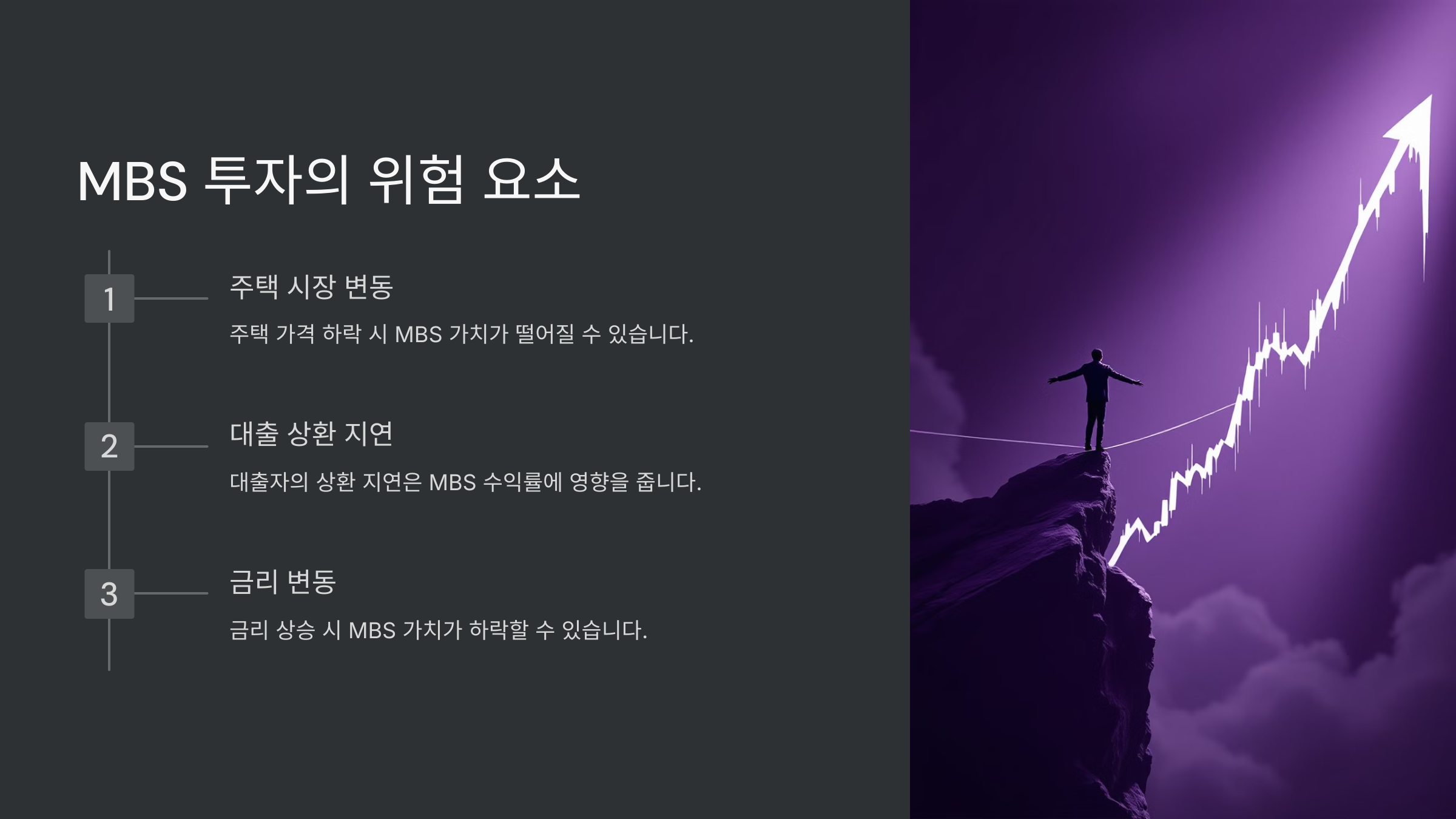 MBS는 시장 변동에 따른 리스크가 있으므로 주택 시장 상황에 대한 사전 분석이 필요합니다.