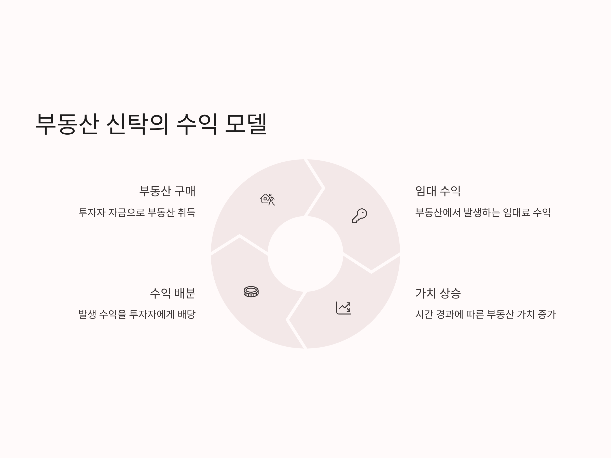 부동산 신탁 투자에서의 수익 모델은 주로 임대 수익과 자산 가치 상승에 의한 시세 차익을 포함합니다. 신탁사는 투자자가 제공한 자금을 통해 부동산을 구매하고, 해당 부동산에서 발생하는 임대료나 수익을 투자자에게 배분합니다. 또한, 시간이 지나면서 부동산 가치가 상승할 경우, 그 차익을 투자자와 나누게 됩니다.