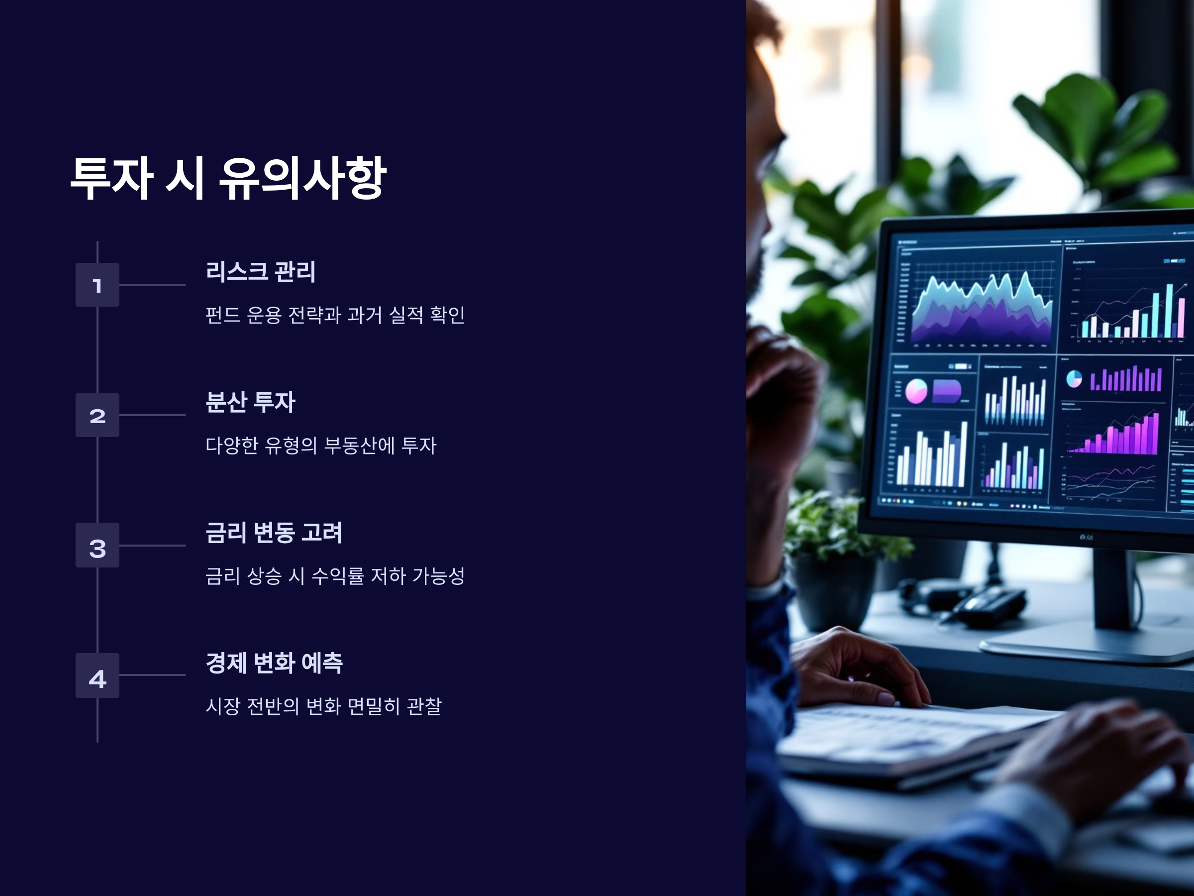 부동산 펀드에 투자할 때 가장 중요한 점은 리스크 관리입니다. 모든 투자는 리스크를 동반하며, 부동산 펀드도 예외는 아닙니다. 따라서 투자자는 펀드의 운용 전략과 과거 실적을 반드시 확인해야 합니다. 또한, 부동산 시장은 경제 전반의 영향을 많이 받기 때문에, 금리 인상과 같은 경제 변화가 펀드 성과에 미칠 영향을 미리 고려하는 것이 중요합니다.