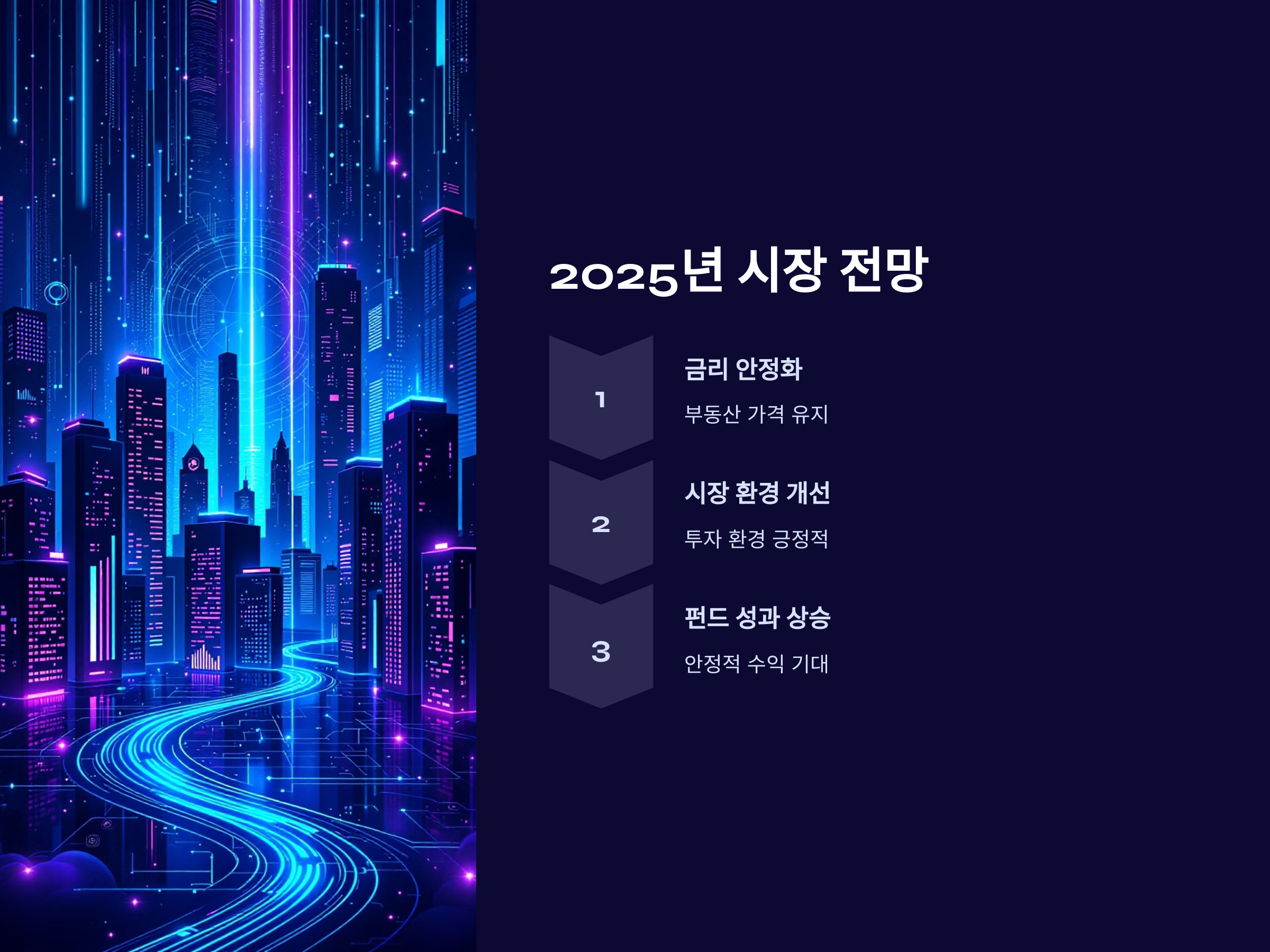 부동산 펀드의 전망은 그 어느 때보다 긍정적입니다. 특히 2025년에는 금리가 다소 안정세를 보일 것이라는 예측이 지배적입니다. 금리가 안정화되면, 부동산 가격의 급격한 하락을 방지하고 안정적인 시장 환경을 만들 수 있습니다. 이에 따라 부동산 펀드도 긍정적인 성과를 기록할 가능성이 높습니다.