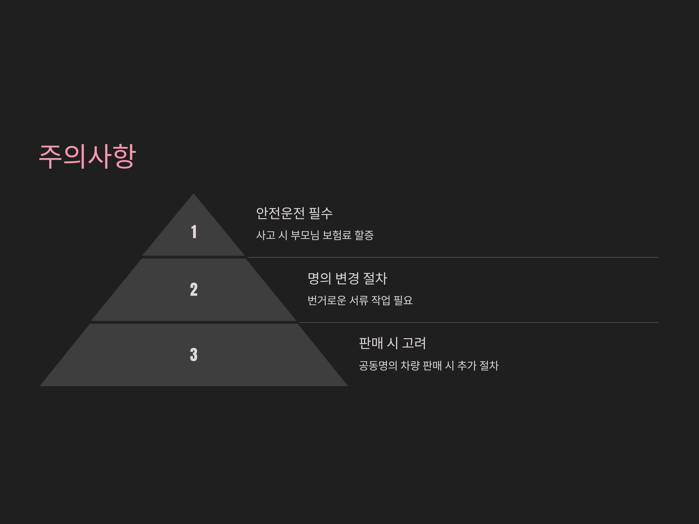 차량 명의를 부모님 앞으로 변경하거나 공동명의로 설정하는 과정이 다소 번거로울 수 있습니다. 또한, 추후 차량을 판매할 때에도 공동명의로 인한 추가 절차가 발생할 수 있습니다.