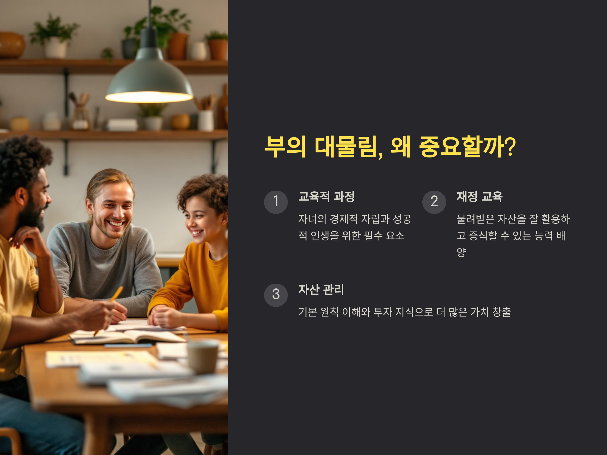 부의 대물림은 돈이나 자산을 물려주는 것에 그치지 않으며, 장기적으로 자녀가 재정적 자유를 얻고 부모가 세운 재정적인 기초를 토대로 자산을 더 확장할 수 있는 능력을 갖추는 것입니다. 이러한 과정을 통해, 부모는 자녀에게 더 큰 경제적 혜택을 전달할 수 있습니다.