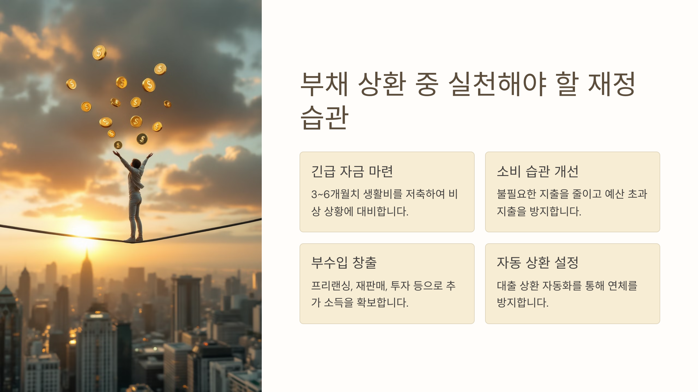 부채 상환 중에도 비상 상황을 대비해 3~6개월치 생활비를 저축합니다. - 소비 습관 개선